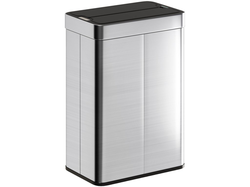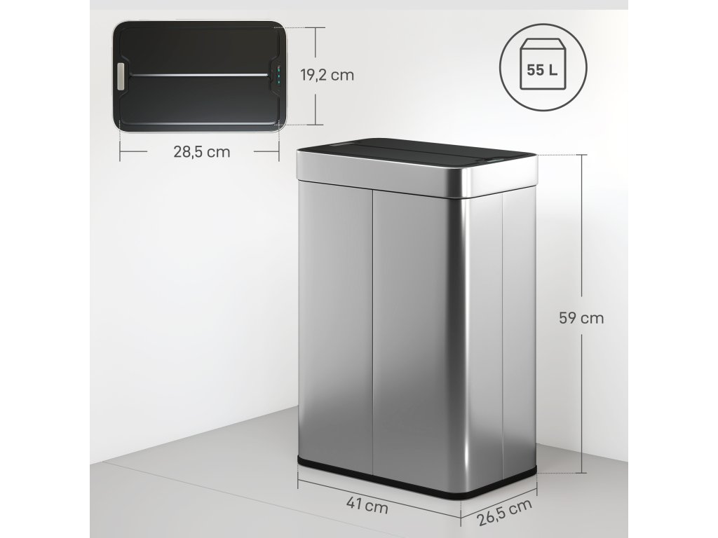 Už vás nebaví nepořádné vyhazování odpadu a bouchání víka, když máte plné ruce? Senzorový koš o objemu 55 l je řešením: Tento koš se perfektně vejde do malých rohů a jeho vysoce citlivý senzor umožňuje bezdotykové ovládání. Dvojitá víka tohoto elektrického koše se tiše zavírají a kartáčovaná nerezová ocel odpuzuje nečistoty a snadno se čistí, což zajišťuje hygienickou a trvale tichou kuchyň.