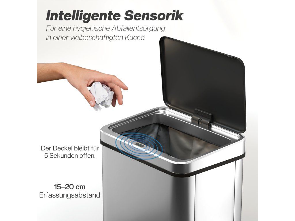 Rychlý senzor pohybu: Pohybem ruky z 15–20 cm se senzorový koš otevře za 0,5 sekundy – ideální pro kuchyně, tělocvičny, kanceláře a prostory s vysokou frekvencí pohybu.