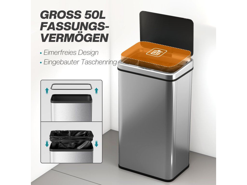 Velkorysý objem 50 l: Tento koš bez vnitřního kbelíku je ideální pro zaneprázdněné rodiny a nabízí více prostoru, čímž se snižuje počet cest k němu. Pojistný kroužek bezpečně drží vložku do koše pro bezproblémové používání.