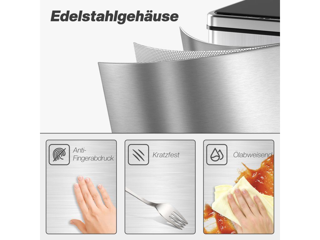 Nerezová ocel odolná proti otiskům prstů: Tento kuchyňský koš na odpadky je vyroben z nerezové oceli 430 o tloušťce 0,4 mm a má kartáčovaný povrch odolný proti otiskům prstů, který odpuzuje nečistoty a zůstává čistý po jednoduchém otření.