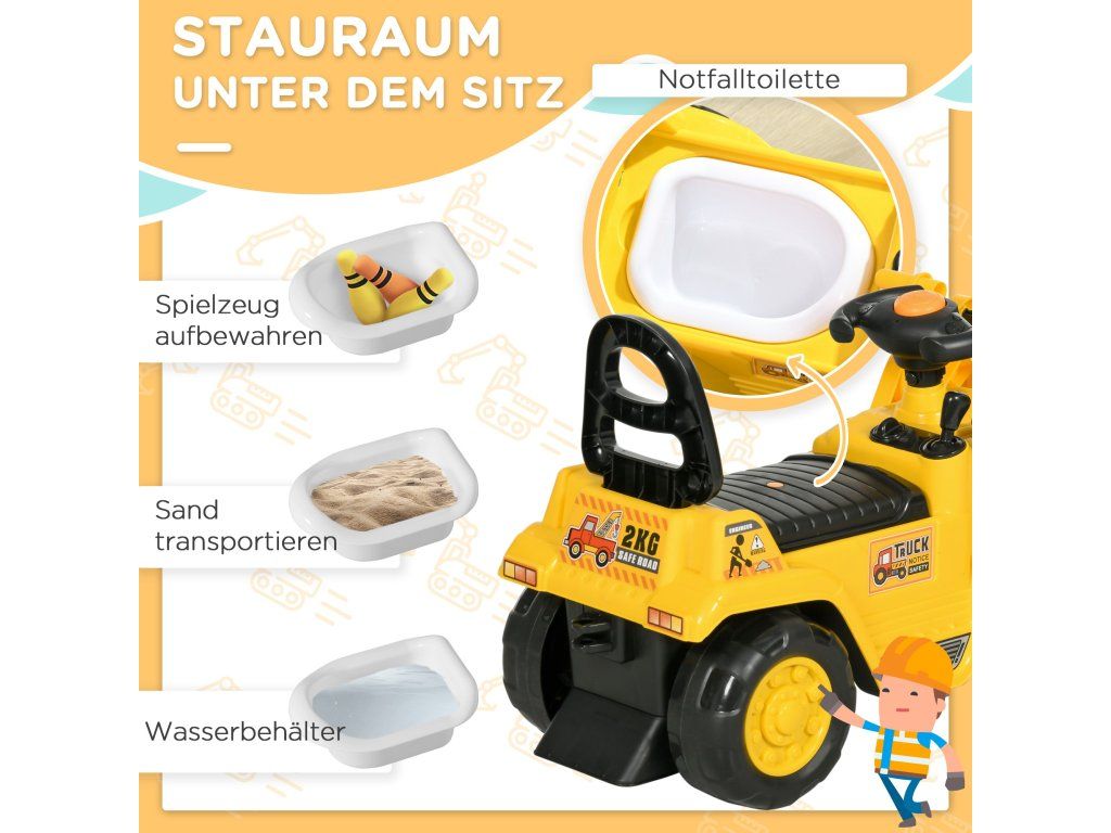 HRÁČKA NA JÍZDU 3 V 1: Tato hračka na ježdění vám umožní jezdit, stavět staveniště a ukládat hračky! Hraní s buldozerem pomáhá vašemu dítěti rozvíjet koordinaci rukou a očí, rovnováhu a mnoho dalšího. Pod utěsněným sedadlem se nachází úložný box na malé hračky.