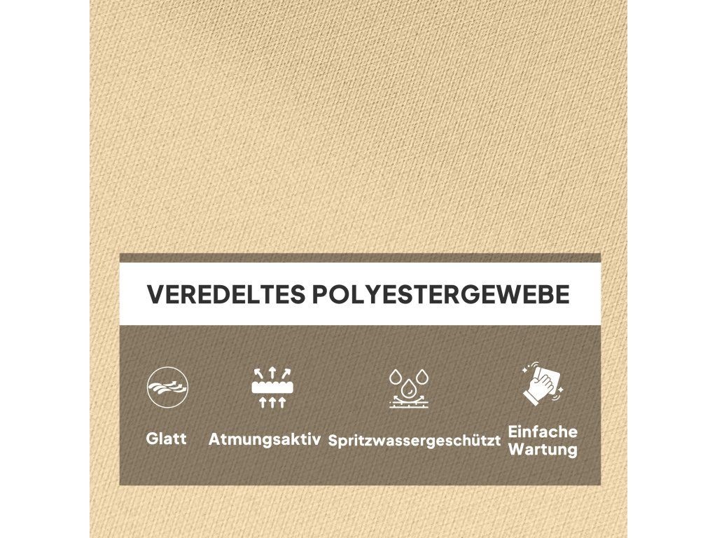 Polyesterový potah: Příjemně měkký na dotek. Odolný vůči vyblednutí a skvrnám. Ideální sedák pro vnitřní i venkovní použití a snadno se o něj pečuje.