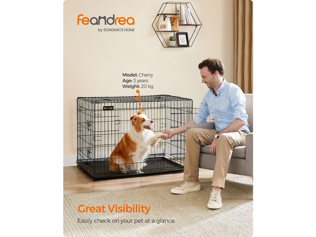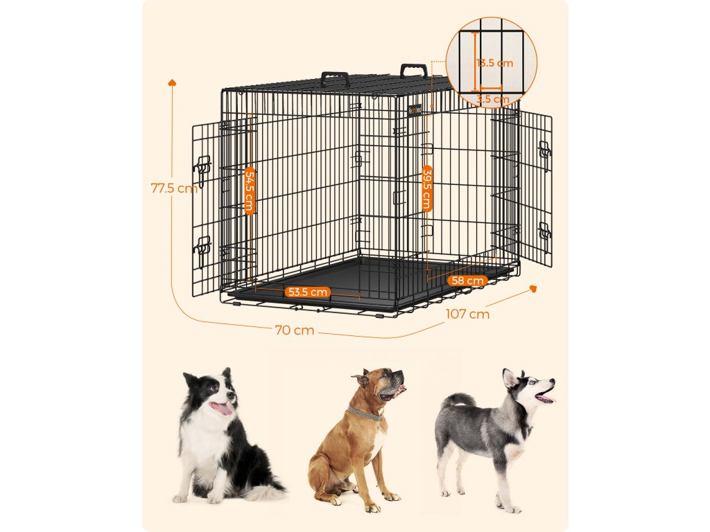 Bezpečné a pohodlné: Vyrobeno z odolného a pevného kovového drátu s hladkým nerezavějícím povrchem bez ostrých hran. tato extra velká přepravka pro psy poskytuje bezpečný a pohodlný prostor pro vašeho psa.Dvojité dveře, dvojité zámky, dvojité zabezpečení: Tato klec pro psy má dvoje dvířka a usnadňuje vašemu chlupatému příteli vstup a výstup. Dvojité zámky ve tvaru písmene L brání vašemu chlupatému příteli, aby si sám otevřel dvířka.Zvolte správnou velikost: Tato drátěná přepravka pro psy o rozměrech 107 x 70 x 77,5 cm je ideální pro psy o hmotnosti 32-42 kg. Doporučená plemena: Doporučené psy: border kolie, husky, buldok atd. Přečtěte si prosím naše tipy pro měření v poznámkách pro výběr správné velikosti.Snadné sestavení, snadné přenášení: Není třeba žádné nářadí, stačí jej rozložit, připevnit klipové zámky a je připraven. Skládací konstrukce a 2 rukojeti na horní straně usnadňují přepravuSnadno se čistí: Skládací přepravka pro psy je vybavena výsuvnou vaničkou ve spodní části, takže ji můžete snadno vysunout a udržet místo vašeho psa v čistotě - váš chlupatý přítel vám za to poděkuje!| Kategorie: | Klece pro psy |