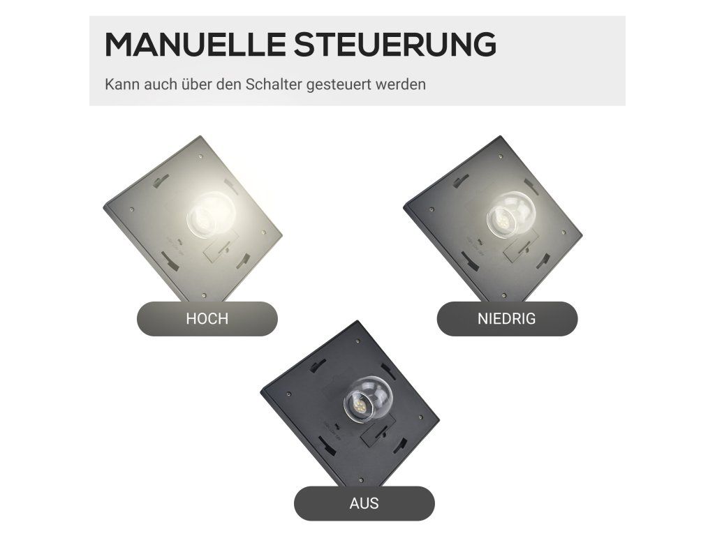 INTELIGENTNÍ SVĚTLO: Automatický světelný senzor se zapne, když je intenzita světla nižší než 3 LUX. Lze jej také ovládat přepínačem (HIGH/LOW/Off) na spodní straně krytu.