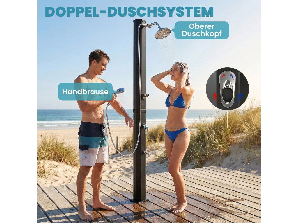 Dvojitý sprchový systém pro flexibilní použití: Díky velkorysé horní sprche pro celotělové sprchování a praktické ruční sprchě nabízí tato solární sprcha všestranné využití, například k čištění nohou, domácích mazlíčků nebo písečného vybavení po venkovních aktivitách.