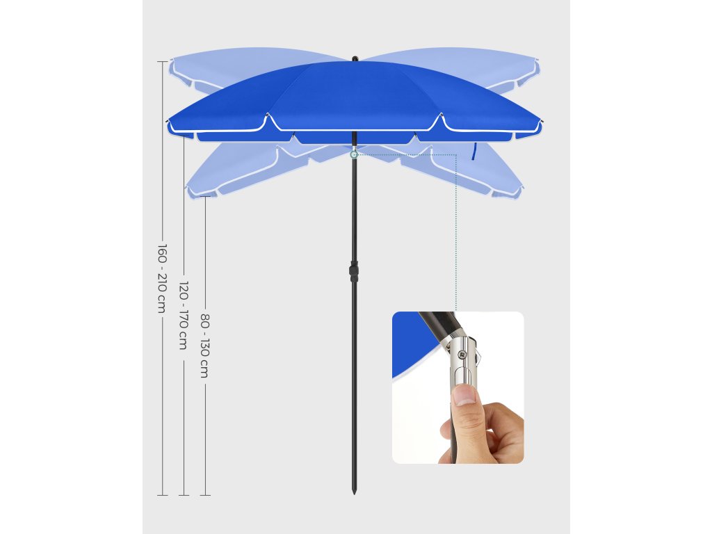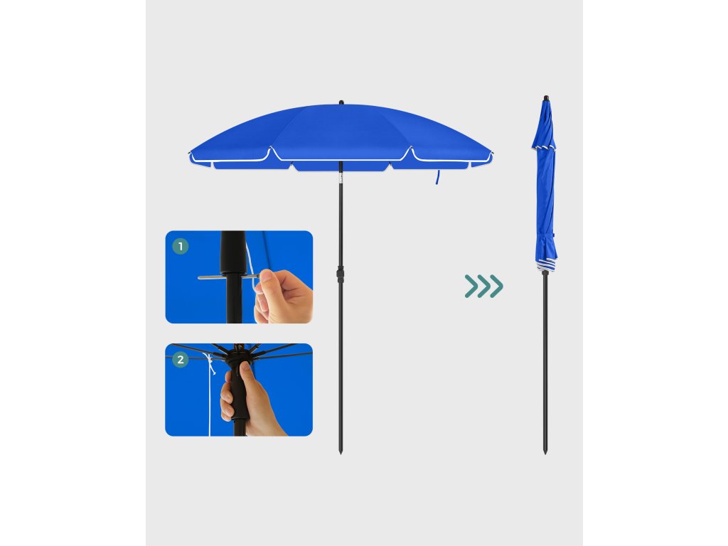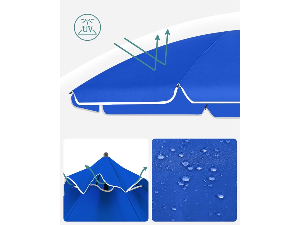 Správný přístřešek: Chystáte se strávit dlouhé dny na pláži, možná i s dětmi? Silná ochrana proti UV záření je nutností! Stejně jako tento slunečník který se může pochlubit stříškou s PA povlakem, která poskytuje vynikající ochranu UPF 50+.Nechte ji, ať vás následuje: Chcete celý den odpočívat na lehátku na pláži? Žádný problém! Tento plážový slunečník snadno nakloníte díky robustnímu kloubu ze zinkové slitiny. abyste mohli být neustále ve stínu a nemuseli se neustále pohybovat.Užijte si vánek! Když fouká chladný vánek, užijte si ho, místo abyste se obávali, že se slunečník bude kývat nebo zlomí: větrací otvor v horní části umožňuje průchod vzduchu. zatímco žebra ze skelných vláken poskytují stabilní oporu pro vrchlík.Kamkoli půjdete: Krásný den na pláži? Kempování s přáteli? Nebo piknik s rodinou? Uložte tento lehký plážový slunečník do praktické přenosné tašky, která je součástí balení, a snadno ho přepravujte. bude se podílet na každém vašem šťastném okamžiku venku.Chladná oáza během okamžiku: Stačí přišroubovat horní část tyče ke spodní, připevnit tyč k podstavci (není součástí balení), otevřít venkovní slunečník, zajistit jej kovovou zátkou a přiložit k němu kovovou zátku. a už budete osvěžovat svou terasu, balkon nebo zahradu!| Kategorie: | Zahradní slunečníky a doplňky |