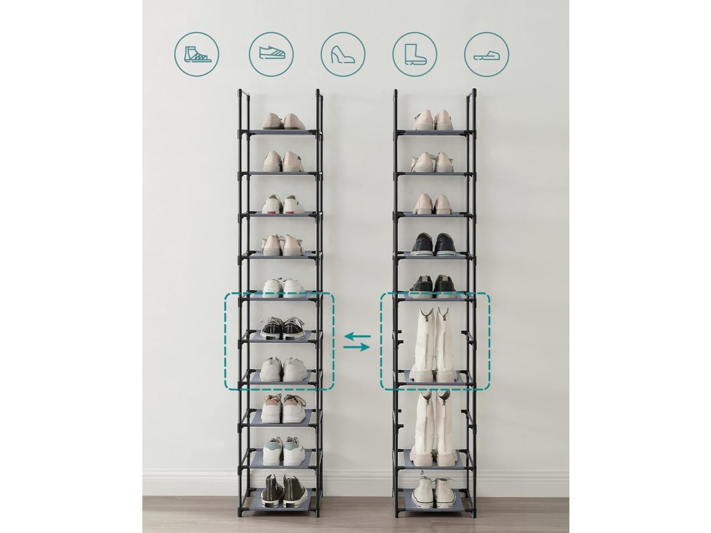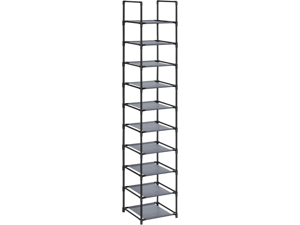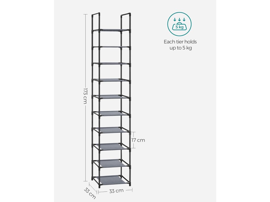 10-patrový botník, stojan na boty, prostorově úsporný úložný prostor na boty, 33 x 33 x 173 cm, kovový rám, police z netkané textilie, do předsíně, ložnice, šedá.