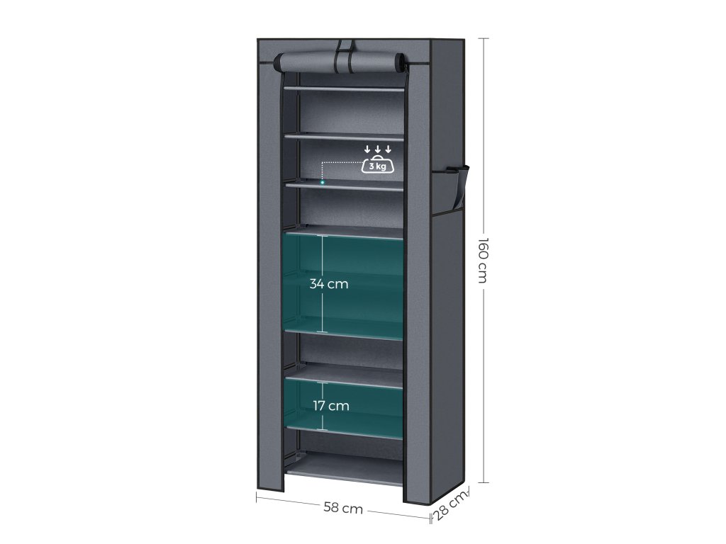 Velká kapacita: Tento stojan na boty o rozměrech 28 x 58 x 160 cm pojme celkem 27-35 párů obuvi a pomůže vám uklidit tenisky, plavky nebo domácí obuv vaší rodiny.Flexibilní police a praktické boční kapsy: Můžete odejmout 1 polici nebo více, aby se vám tam vešly vyšší boty, jako jsou kozačky a vysoké podpatky; boční kapsy skříně na boty jsou určeny na leštidla na boty, kartáče nebo jiné potřeby na boty;Stabilní a robustní: Každá vrstva unese až 3 kg.: Robustní kovové trubky spojené zesílenými plastovými spojkami vytvářejí stabilní organizér na boty. Při nazouvání a vyzouvání bot se již neviklají!.Prachotěsný kryt a voděodolná police: Tento organizér na boty můžete zapnout, aby se na boty neprášilo; látkové vrstvy jsou odolné proti vodě, takže je stačí otřít vlhkým hadříkem, pokud se zašpiní;Jednoduchá montáž: Stojan na boty lze sestavit během chvilky: spojte trubky plastovými konektory a sestavení tohoto stojanu na boty je hotovo během chvilky! Co dál? Postavte si jej do předsíně, šatny nebo ložnice, abyste zkrotili své boty| Kategorie: | Botníky |