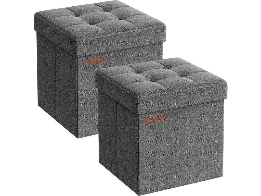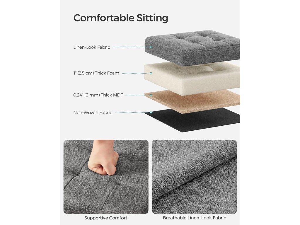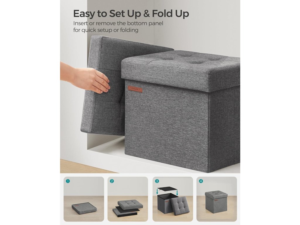 Stylové a robustní Tyto úložné otomany mají elegantní plátěný vzhled s jemným prošíváním. Silné, robustní dřevovláknité desky umožňují každému otomanu unést až 286 liber (120 kg).Pohodlné sezení: Tyto úložné lavice jsou vyplněné pěnou s vysokou hustotou a potažené látkou ve vzhledu lnu a poskytují měkké a pohodlné sezení. podpůrné a prodyšné sezení pro optimální pohodlí. Dostatek úložného prostoru: Každý z těchto skládacích otomanů má rozměry 11,8" D x 11,8" Š x 11,8" V a celkovou kapacitu 6 galonů (22 litrů). lze použít k přehlednému uspořádání povlečení, polštářů, přikrývek, časopisů a mnoha dalších věcí.Snadno se nastavuje a skládá: Díky jedinečné skládací konstrukci lze tyto lavice postavit během několika sekund. Když je nepoužíváte, pohodlně je složíte pro snadné uskladnění, čímž ušetříte místo ve vaší domácnosti.Všestranné využití: Tyto úložné otomany můžete použít jako úložné boxy, podnožky nebo dokonce konferenční stolky. Můžete je umístit kamkoli, například do obývacího pokoje, na konec postele, do chodby nebo pod okno.| Kategorie: | Taburety |