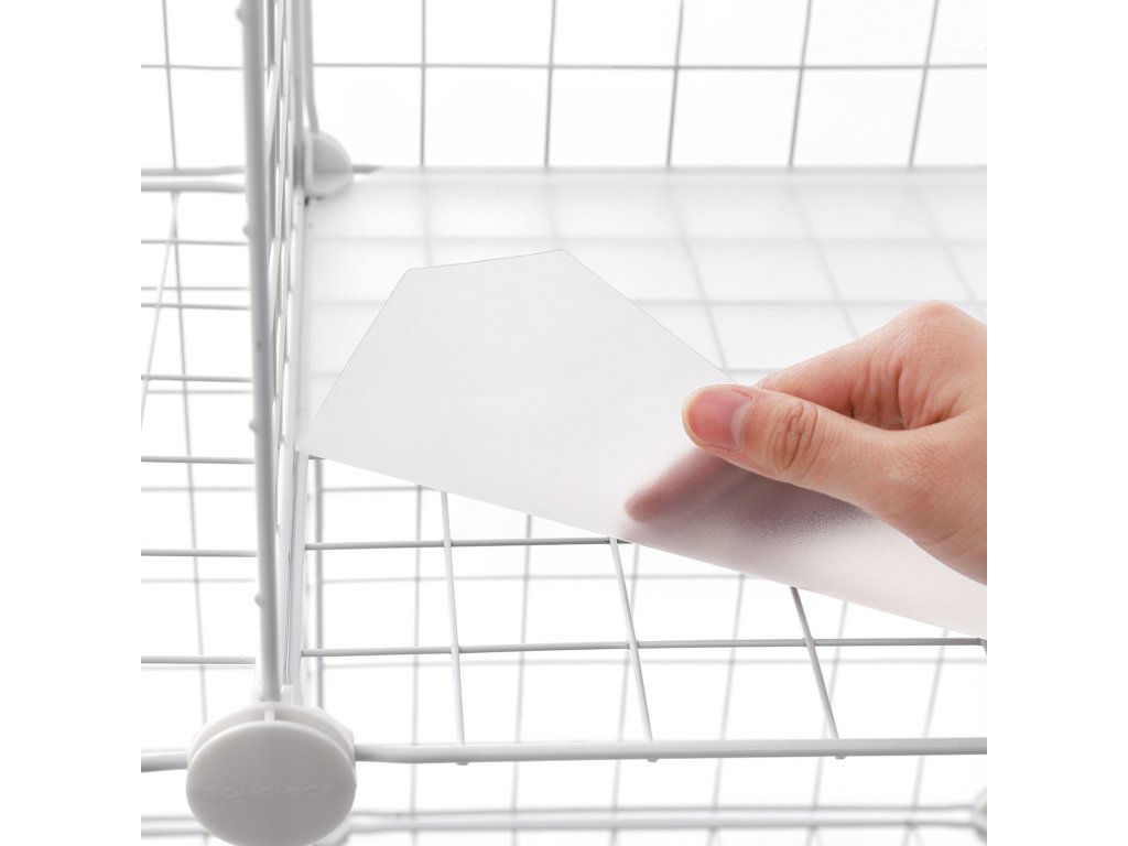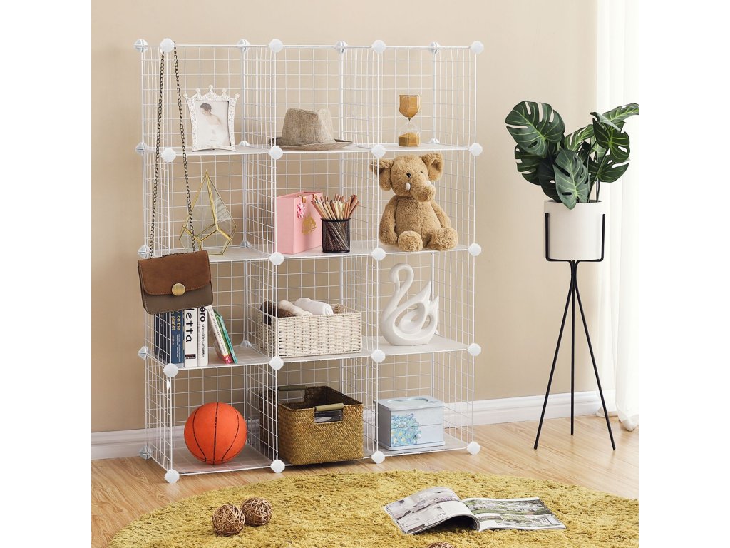 Drátěný mřížový úložný regál, propojovací regál s kovovými síťovými policemi a plastovými deskami z PP, 12 kostek, bílá.