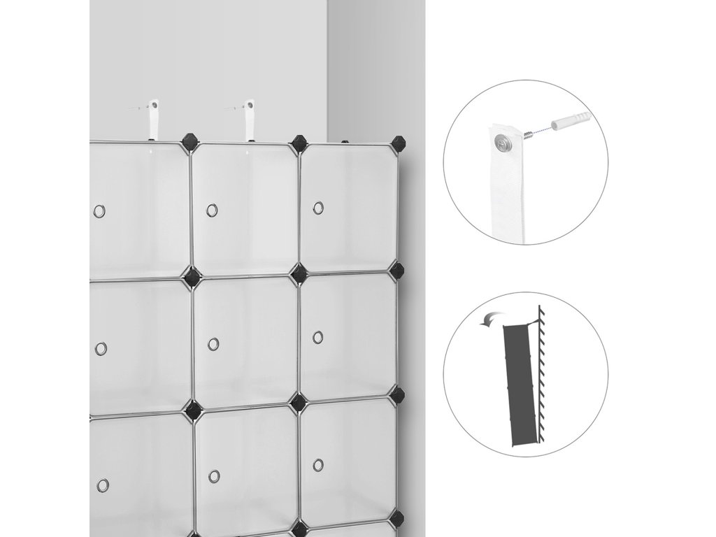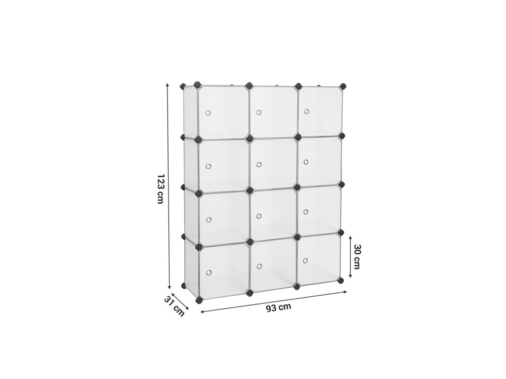 BEZPROBLÉMOVÉ SKLADOVÁNÍ: Tato úložná skříň se dodává s 12 kostkami o rozměrech 30 x 30 x 30 cm. Ať už se jedná o oblečení, boty, časopisy nebo hračky, vše lze snadno uspořádat - otevřít, umístit, zavřít a hotovo.PŘIZPŮSOBTE SI JI PODLE SVÝCH POTŘEB: Šatní skříň v ložnici? Věšák na boty v předsíni? Nebo úložný regál ve sklepě? Dokonce i pod schody nebo na půdě - přizpůsobte si tuto skříň do tvaru, který potřebujete. aby bylo možné optimalizovat nevyužitý prostor.DVEŘE S PEVNÝM ZÁVĚSEM: Malé hračky padají z polic? Zapráší se oblečení uvnitř? Každá kostka je vybavena dvířky, která vám pomohou tyto problémy jednou provždy vyřešit. Obáváte se otevírání dveří? Přiložené háčky ve tvaru deštníku tomu zabrání.Jednoduché jako facka: Úklid nebo stěhování úložné skříně může být opravdu problematické. Ne však tato. Voděodolné, lehké plastové panely umožňují v případě skvrn jednoduše otřít vlhkým hadříkem a snadno je zvednout, když je potřebujete přemístit.MONTÁŽ JE ZÁŽITEK: Přijďte si užít radost z montáže. Díky jednoduché konstrukci, přiložené paličce a podrobnému návodu nebyla montáž tohoto úložného organizéru nikdy jednodušší!| Kategorie: | Úložné boxy |