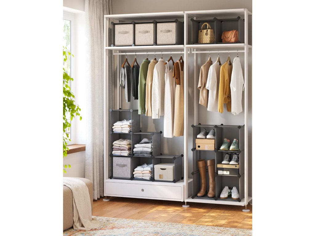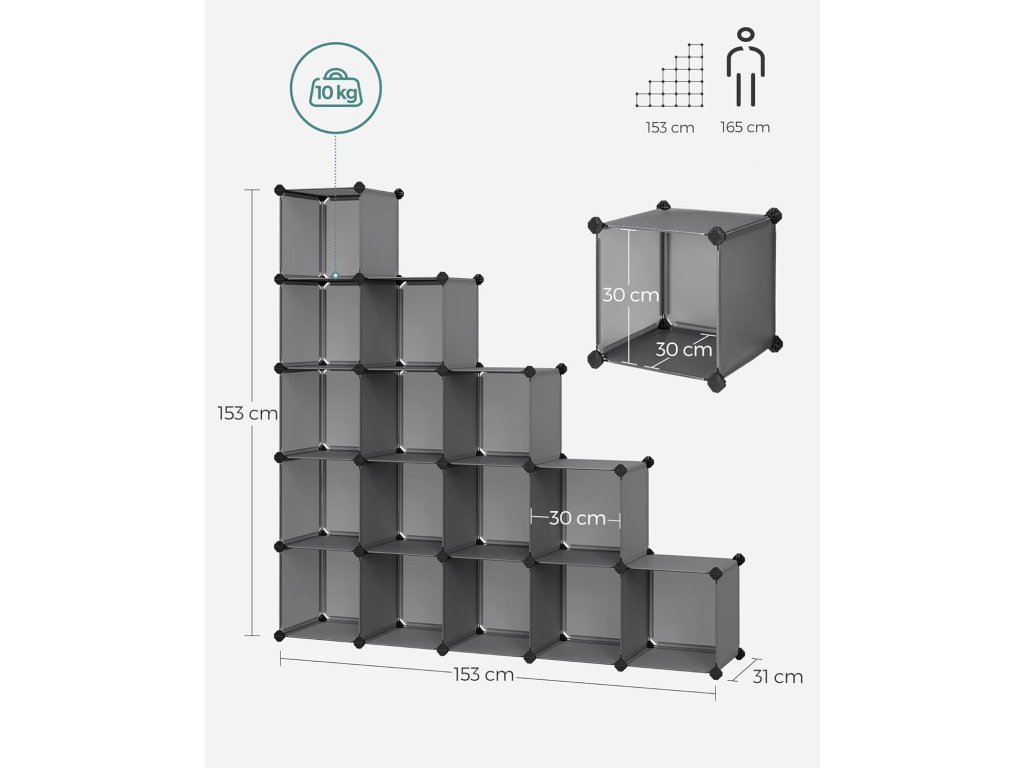 15 kostek, modulární organizér, plastový regál, rozdělovač skříní, úložný prostor na boty, do ložnice, kanceláře, 153 x 31 x 153 cm, šedá.