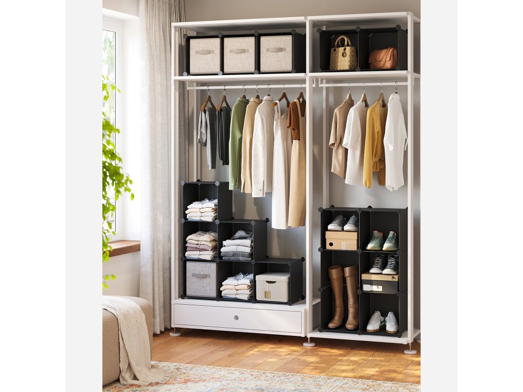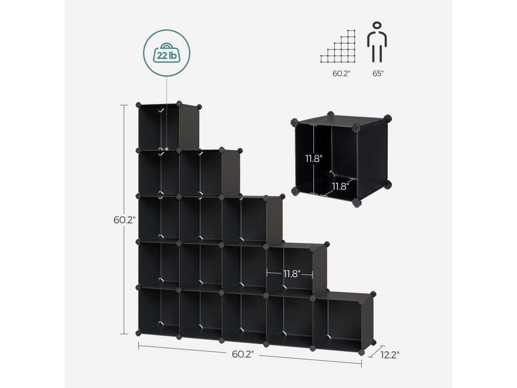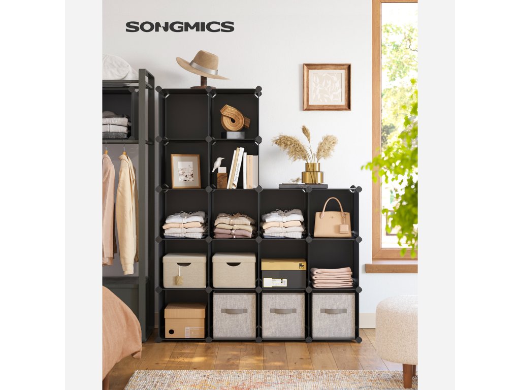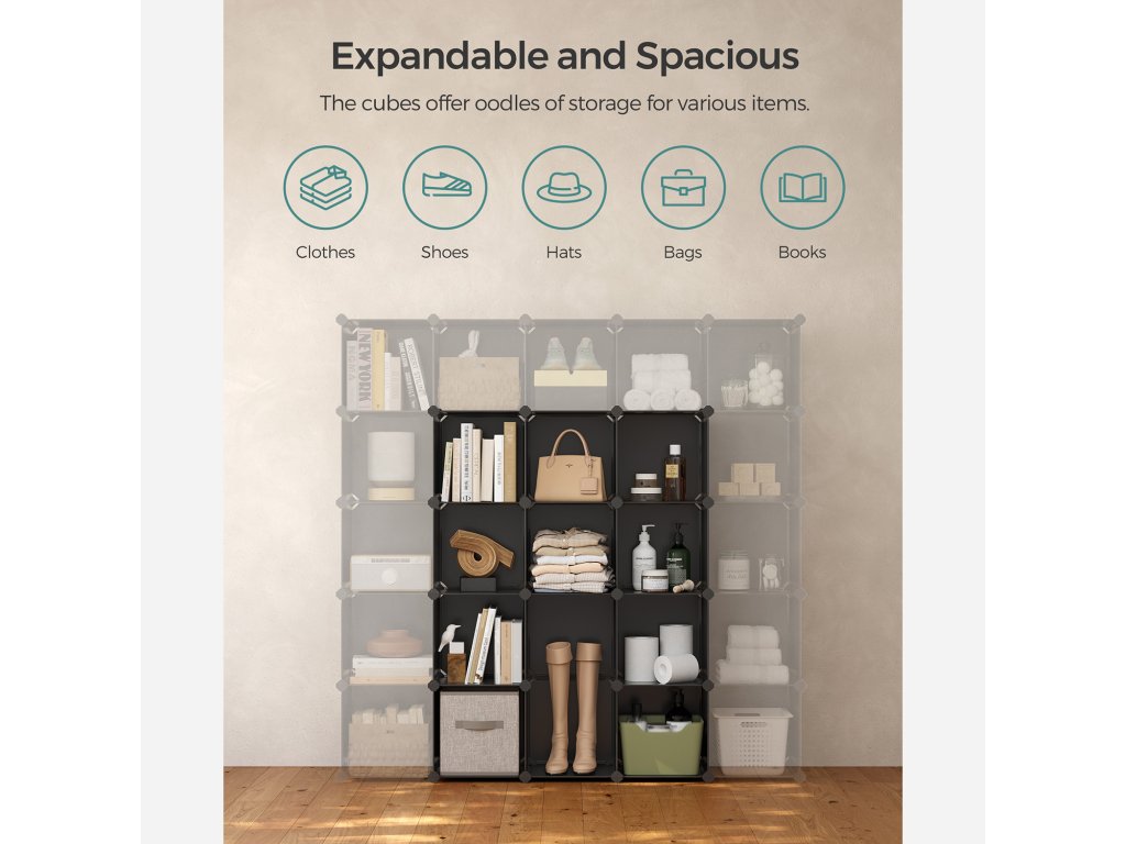 15-ti kostkový úložný box, botník, DIY policový systém, stohovatelné kostky, PP plastový regál, šatní skříň, rozdělovač skříní, pro ložnici, kancelář, černý.