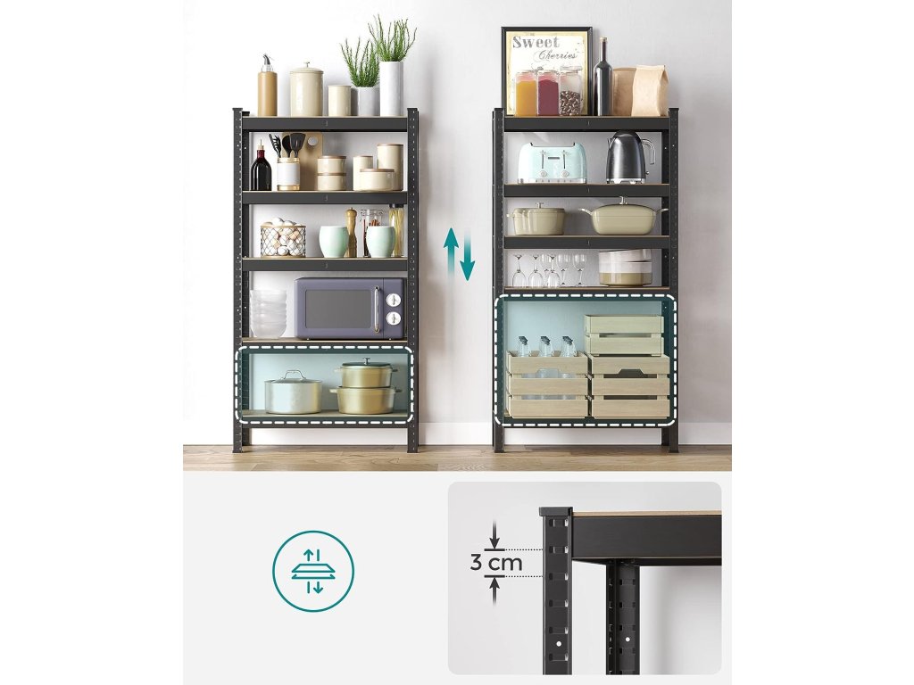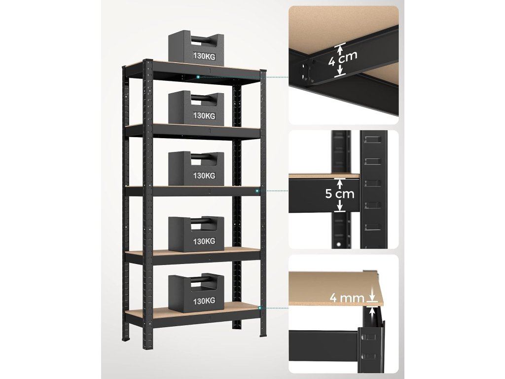 Dělitelné Každou kovovou polici lze rozdělit na 2 samostatné jednotky, které vyhovují vašim potřebám a úložnému prostoru. Po rozdělení se skvěle hodí i jako pracovní stůl s úložným prostorem. [Nastavitelné police] Každou úroveň lze snadno nastavit každé 3 cm, což vyhovuje vašim potřebám ukládání předmětů různých velikostí. [Velké rozměry, velká kapacita] S rozměry 30 x 75 x 150 cm a celkovou nosností 650 kg na každé z nich lze tyto police použít v garáži, skladu, sklepě nebo prádelně k uspořádání veškerého nářadí a vybavení. JEDNODUCHÁ MONTÁŽ BEZ ŠROUBŮ - Díky vzájemně propojené konstrukci a jasnému návodu se tyto robustní police snadno montují.| Kategorie: | Regály a poličky |