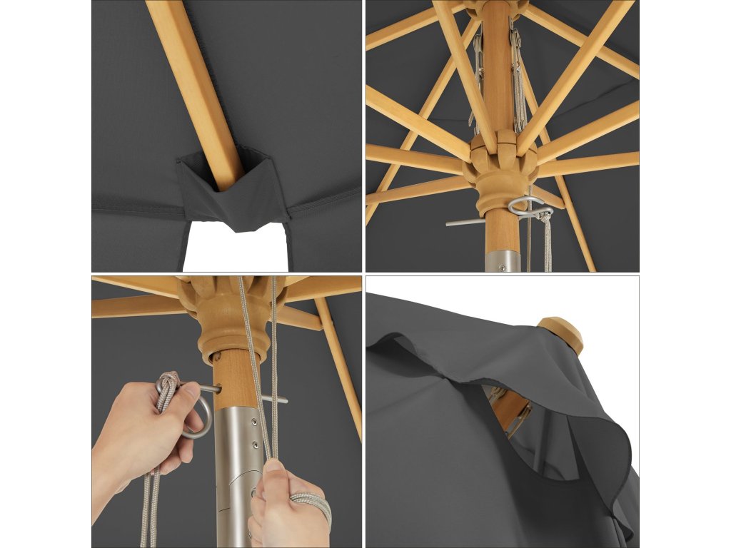 Osmiúhelníkový slunečník s ochranou proti slunci, dřevěná tyč a žebra, mechanismus naklápění, podstavec není součástí dodávky, pro balkon terasu zahradu venku, šedý.