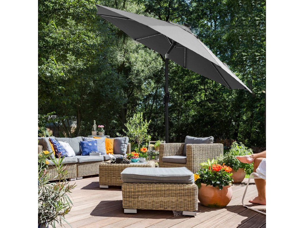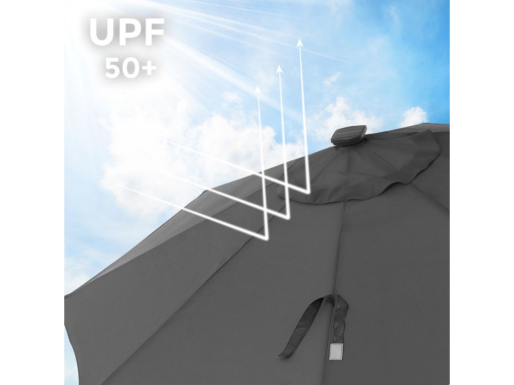 3 m zahradní slunečník se solárním LED osvětlením, slunečník s ochranou UPF 50+, naklápěcí, klička pro otevírání a zavírání, podstavec není součástí balení, šedá.