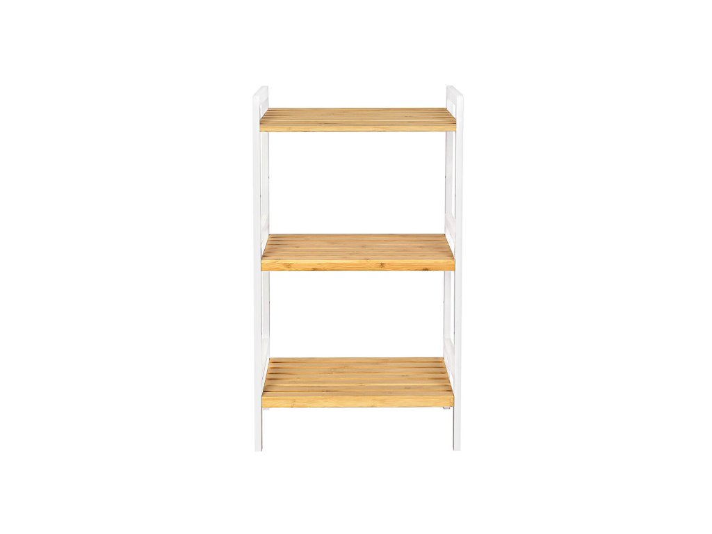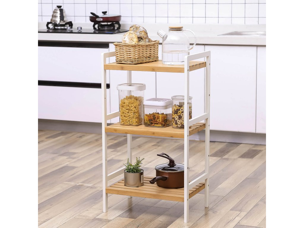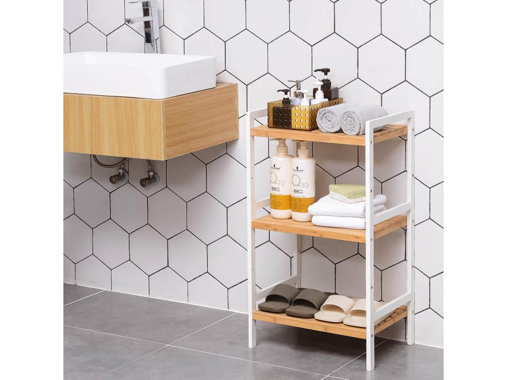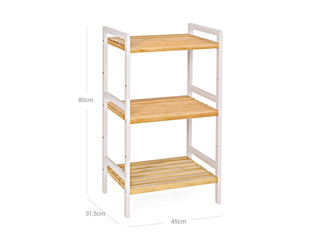 3-patrový bambusový úložný regál do koupelny, kuchyně, ložnice, 45 x 31,5 x 80 cm, přírodní dřevo a bílá.