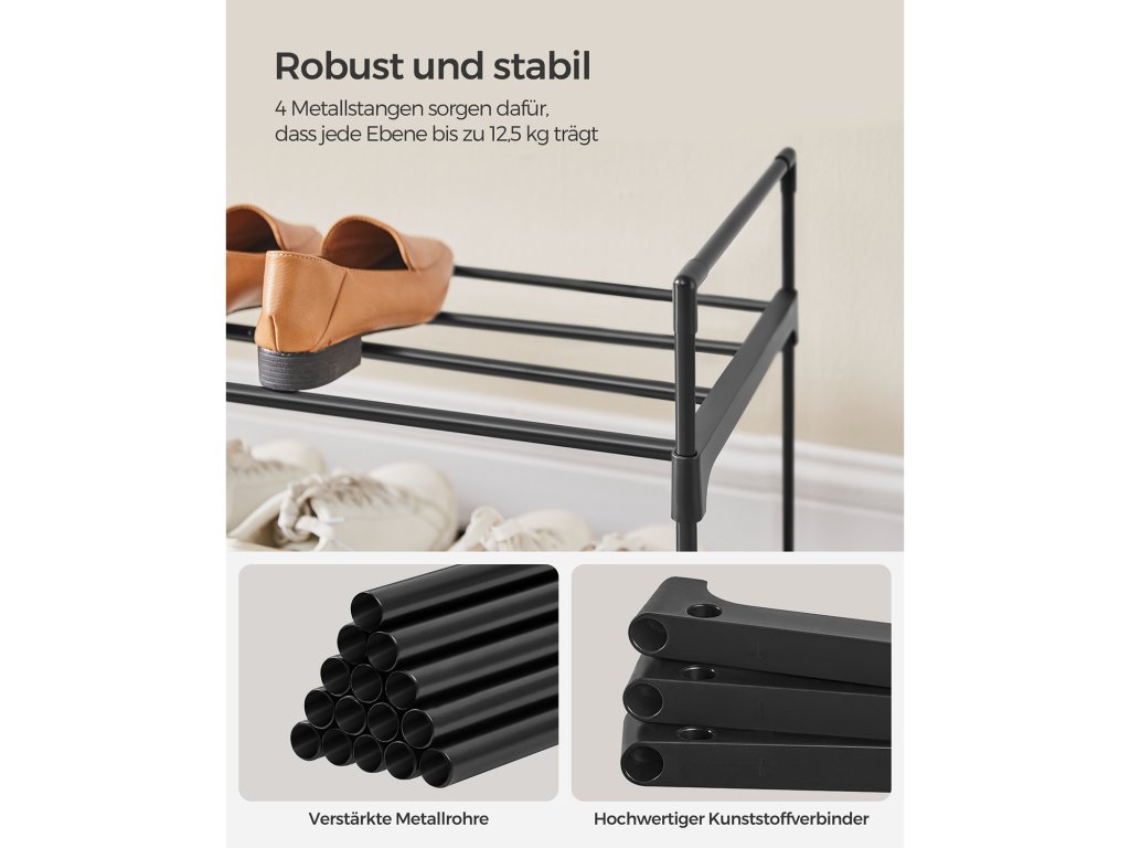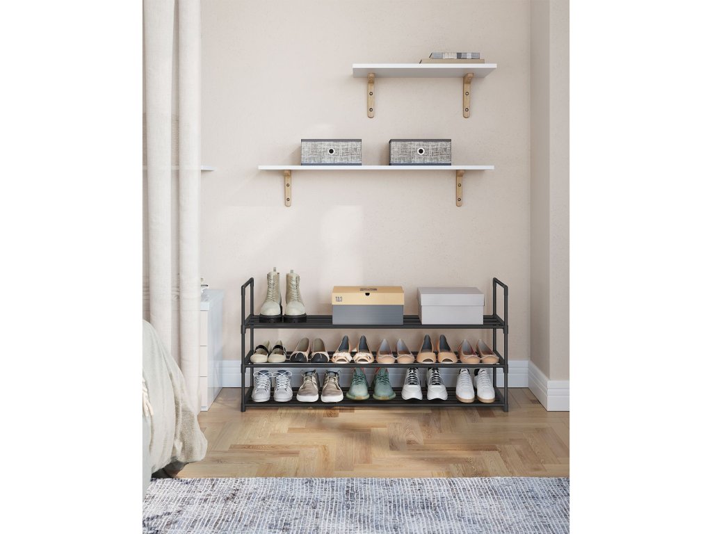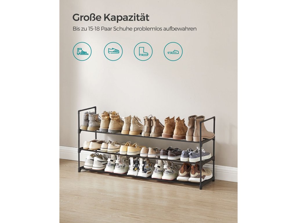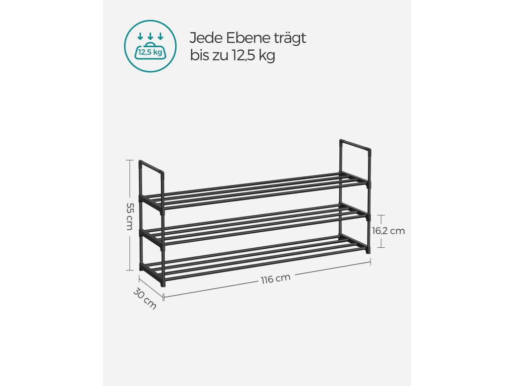3-patrový botník, organizér na boty, kovový úložný regál, vhodný pro 15 až 18 párů bot, stohovatelný regál na boty, do předsíně, obývacího pokoje, ložnice, 116 x 30 x 55 cm, černý.