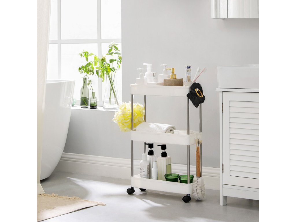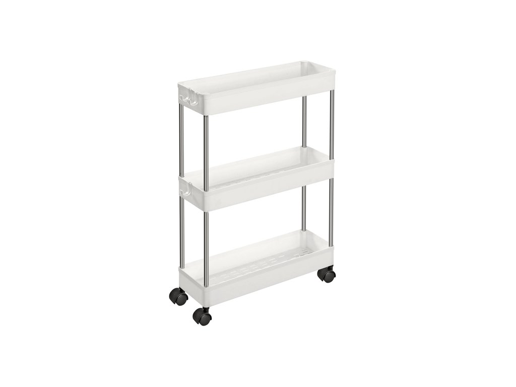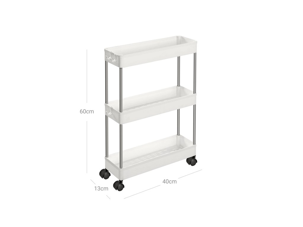 3-patrový úložný vozík, kuchyňský vozík na kolečkách, úzký vozík do kuchyně, koupelny, kanceláře nebo malých prostor, 42 x 13,5 x 61 cm, bílý.