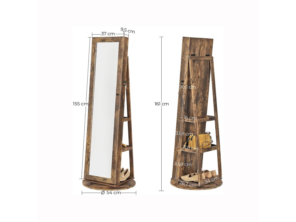 Otočná šperkovnice, vysoké zrcadlo po celé délce, uzamykatelný organizér na šperky s vestavěným malým zrcadlem, zadní odkládací police, rustikální hnědá.
