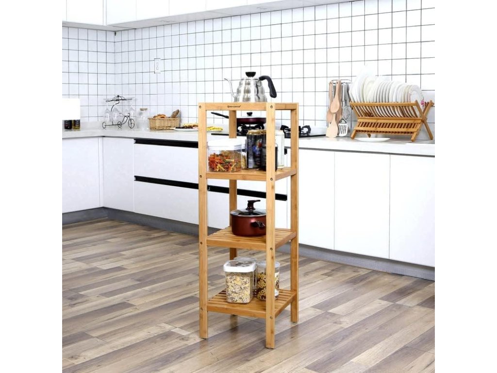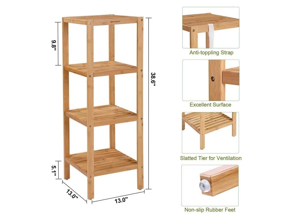 Multifunkční bambusový stojan: 100% přírodní bambus, šetrný k životnímu prostředí a odolný; Čtyřpatrový policový regál a úložný prostor pro koupelnové předměty, ručníky, drobnosti, dekorativní předměty, drobnosti, boty, knihy, rostliny, koření a drobné pomůcky v koupelně, obývacím pokoji, na balkoně, v kuchyni atd.;Pečlivé zpracování, používejte jej podle svých představ: přírodní a hladký povrch, zaoblené rohy, chrání vaši rodinu před poškrábáním, zejména děti. Pro vysoké předměty můžete vyjmout vodováhu.Zvažované příslušenství: 4 protiskluzové podložky ve spodní části každé nohy chrání podlahu před poškrábáním.Snadná montáž a demontáž: Snadná montáž: antikorozní a odolné šrouby, lze opakovaně montovat a demontovat, nářadí je součástí dodávky.Prostorově úsporný úložný regál: Velikost výrobku: 38 5/8 "D x 12 7/8 "Š x 12 7/8 "V, štíhlá postava, která může být na jakémkoli vhodném místě ve vašem domě.| Kategorie: | Koupelnové regály |