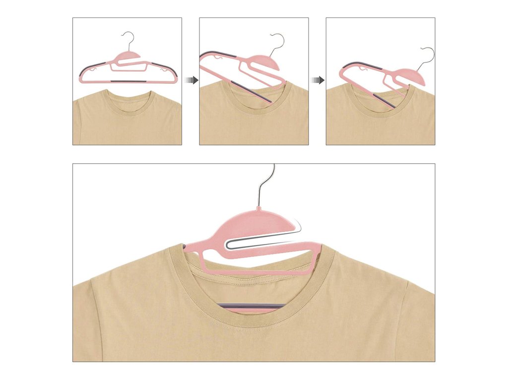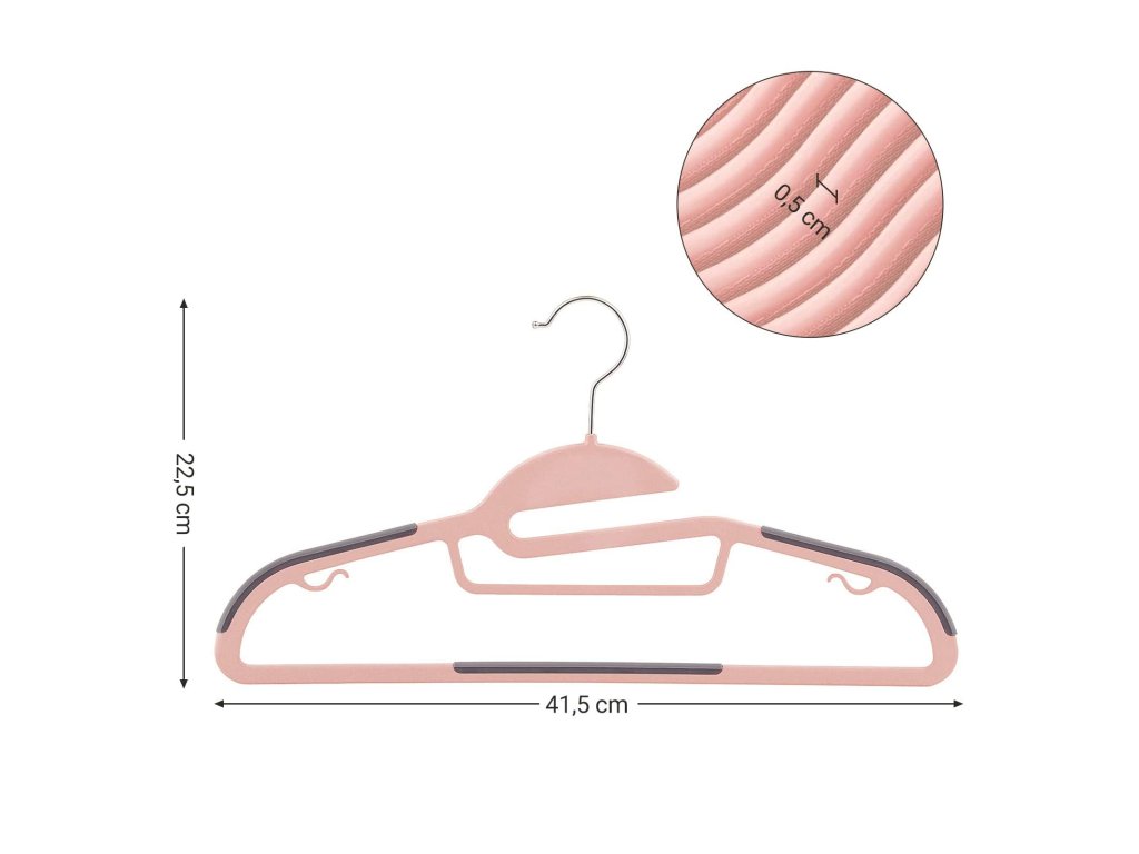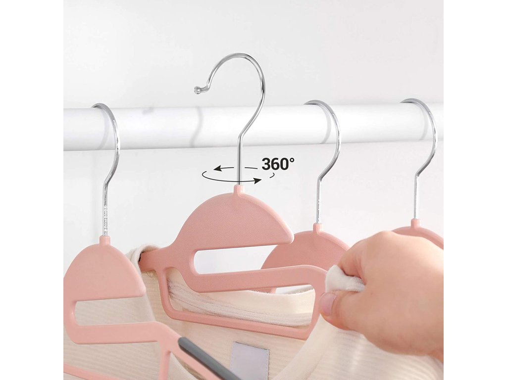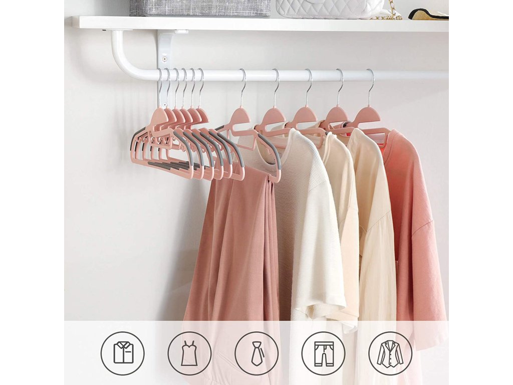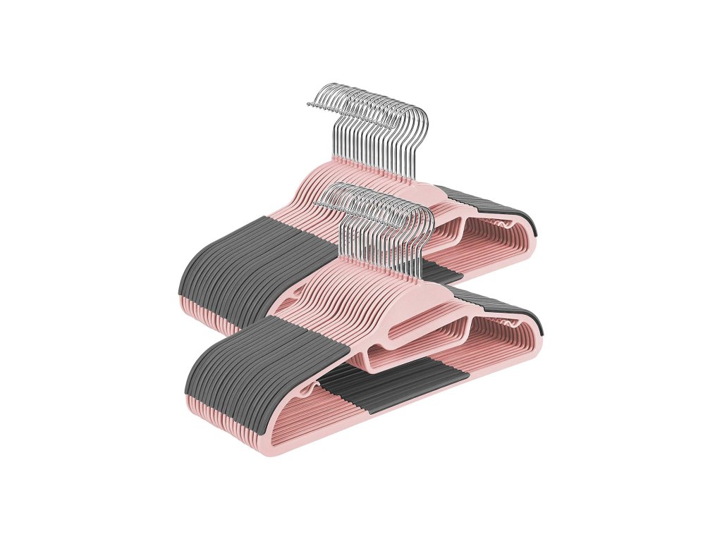 Balení věšáků na kabáty 50ks, kvalitní plastové věšáky na obleky, odolné, s otvorem ve tvaru S, protiskluzové, odolné, tloušťka 0,5 cm, šetří místo, otočný háček o 360°, růžová a tmavě šedá.