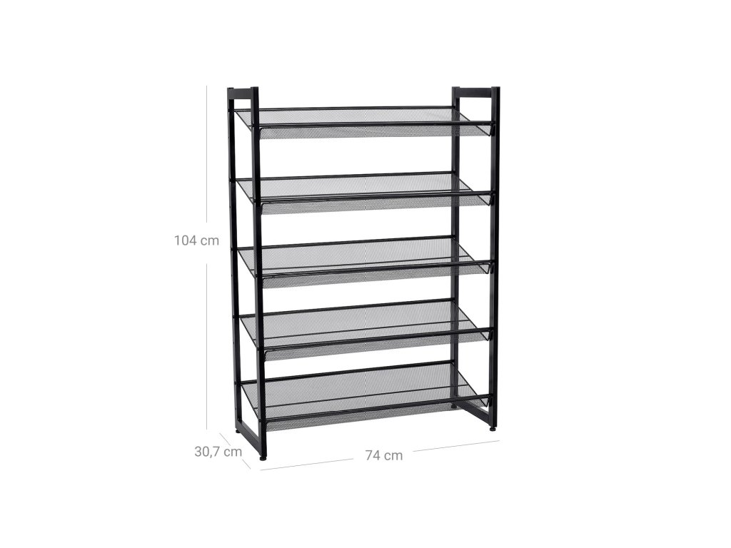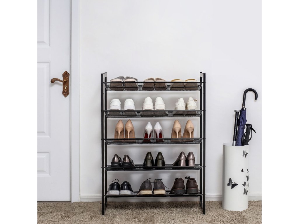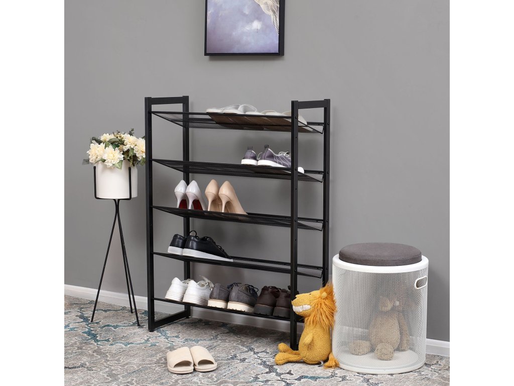 5patrový kovový síťovaný botník s plochými úhlovými policemi, velký stohovatelný a nastavitelný organizér pro uložení bot v předsíňové skříni, černý.