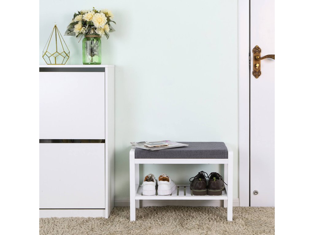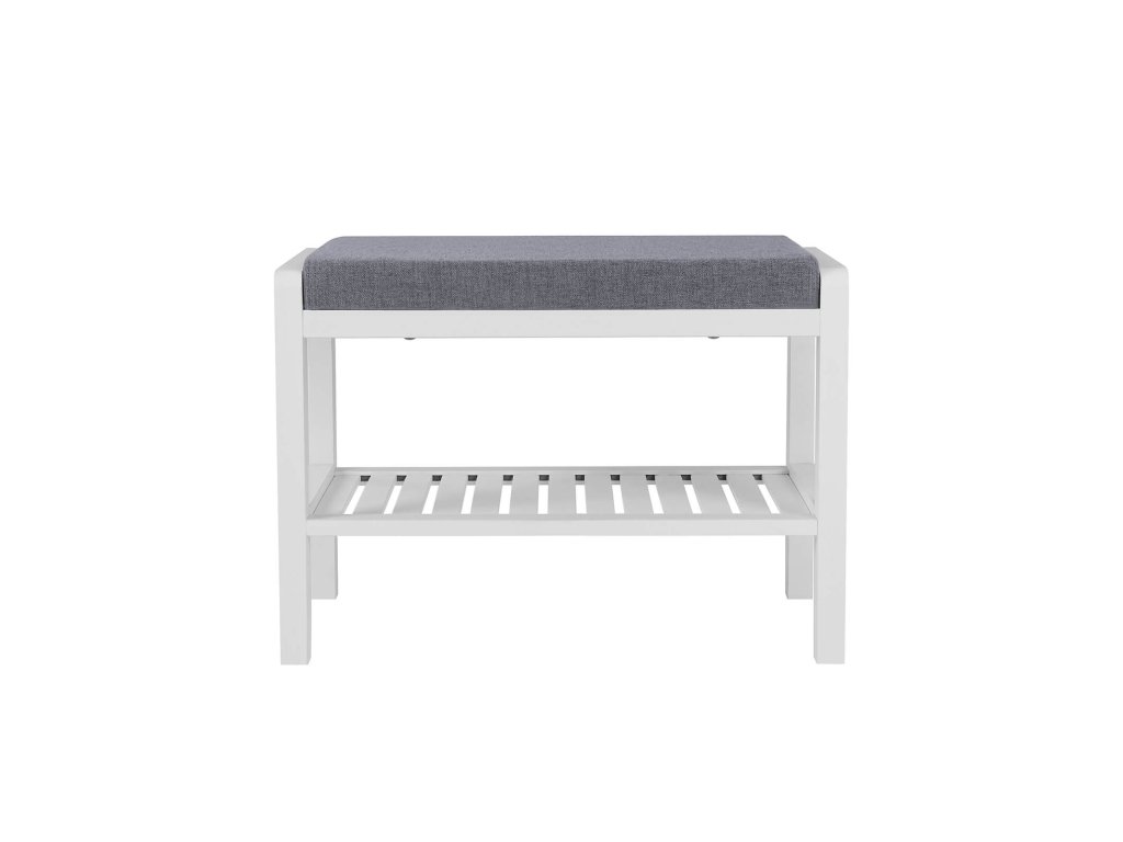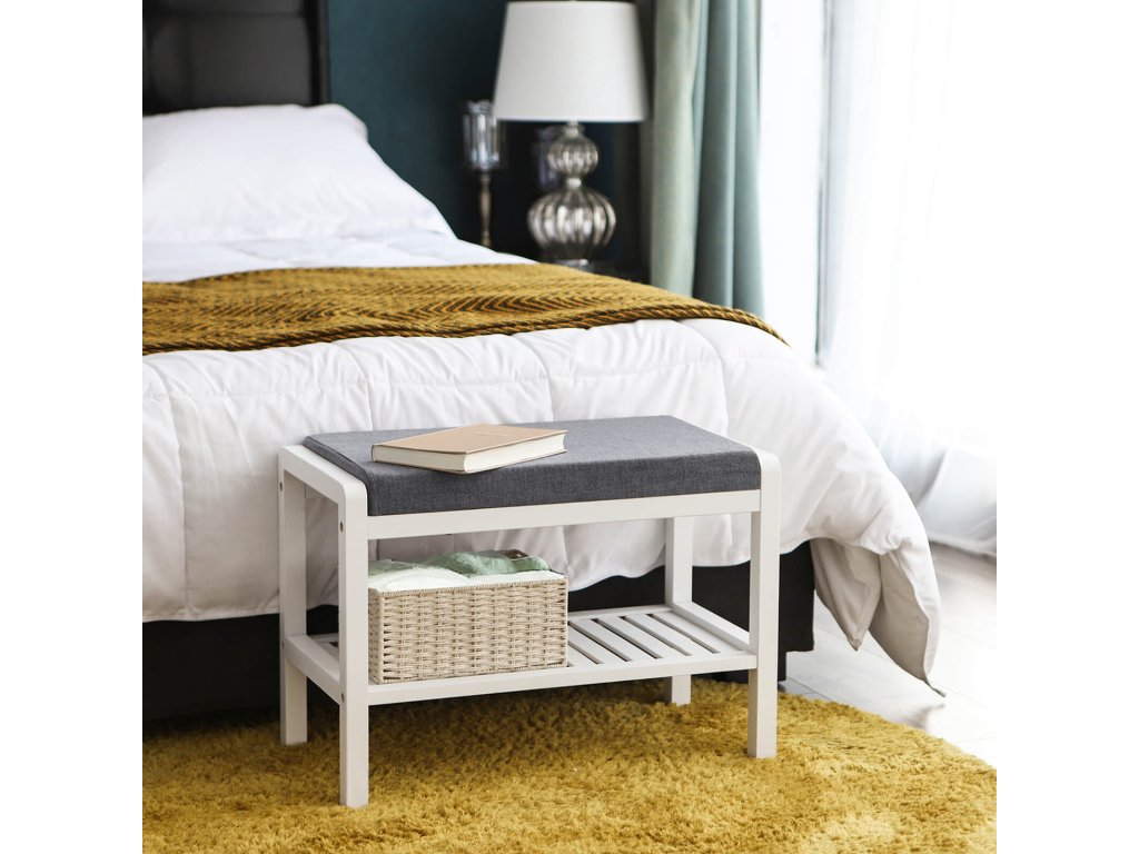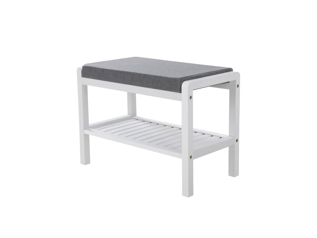 Bambusová lavice na boty s polstrovaným sedákem, odkládací police pro vchod, obývací pokoj, foyer, malé prostory, bílá.