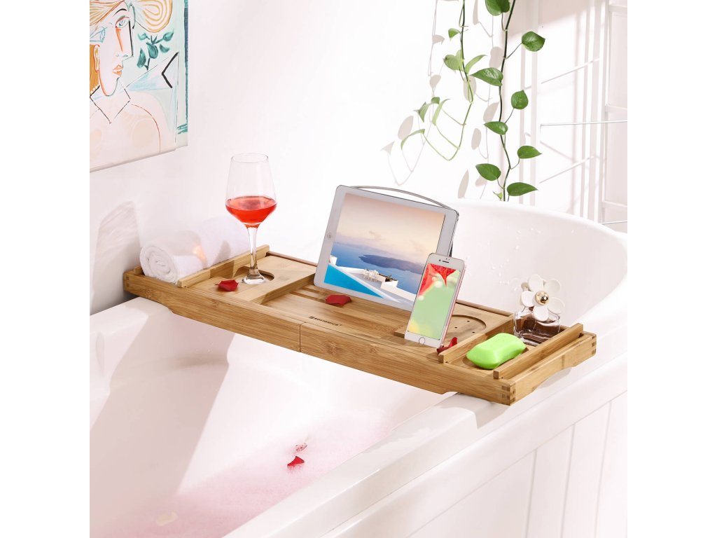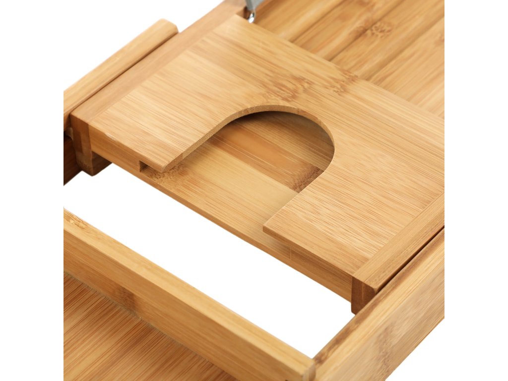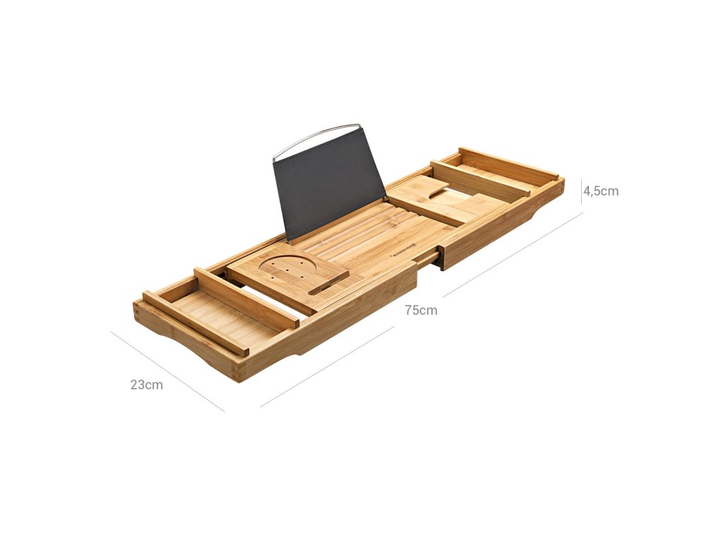 Výsuvná bambusová polička do vany s nápojem, stojanem na knihy, držákem na mýdlo 75-109 x 4,5 x 23 cm (š x v x h), přírodní, (75-109) x4,5x23cm.