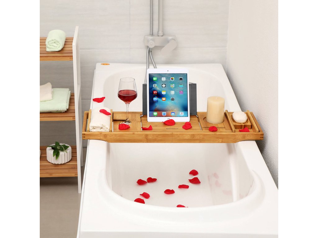 LUXUSNÍ Koupel s vaničkou: Uklidňující hudba, vonné svíčky, květiny na poličce ve vaně - pohodlně se usaďte a užijte si pětihvězdičkovou koupel. Po náročném dni si ji zasloužíte!Vzrušující pěnová koupel: s touto koupelovou podložkou je nudnému koupání konec. Nyní můžete sledovat film na tabletu, číst si knihu nebo pít sklenku vína a přitom se zabalit do teplé vody. Zásobník má také 2 malé odnímatelné přihrádky.Rozšiřitelná - stačí vysunout boční strany této desky a nastavit ji v rozmezí 75 až 109 cm a přizpůsobit šířku vany.