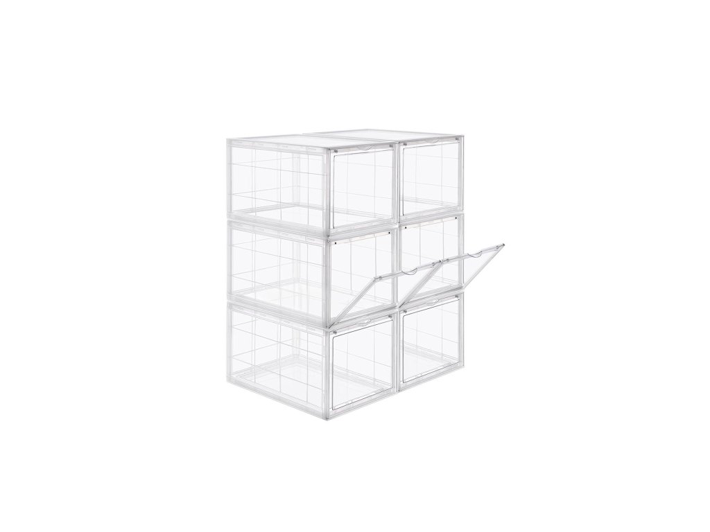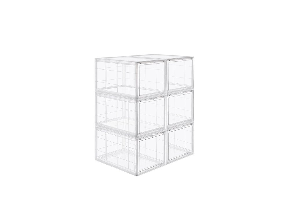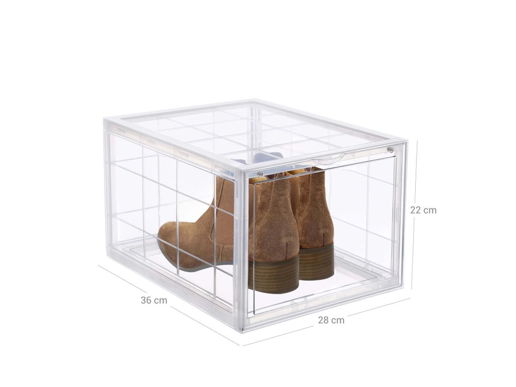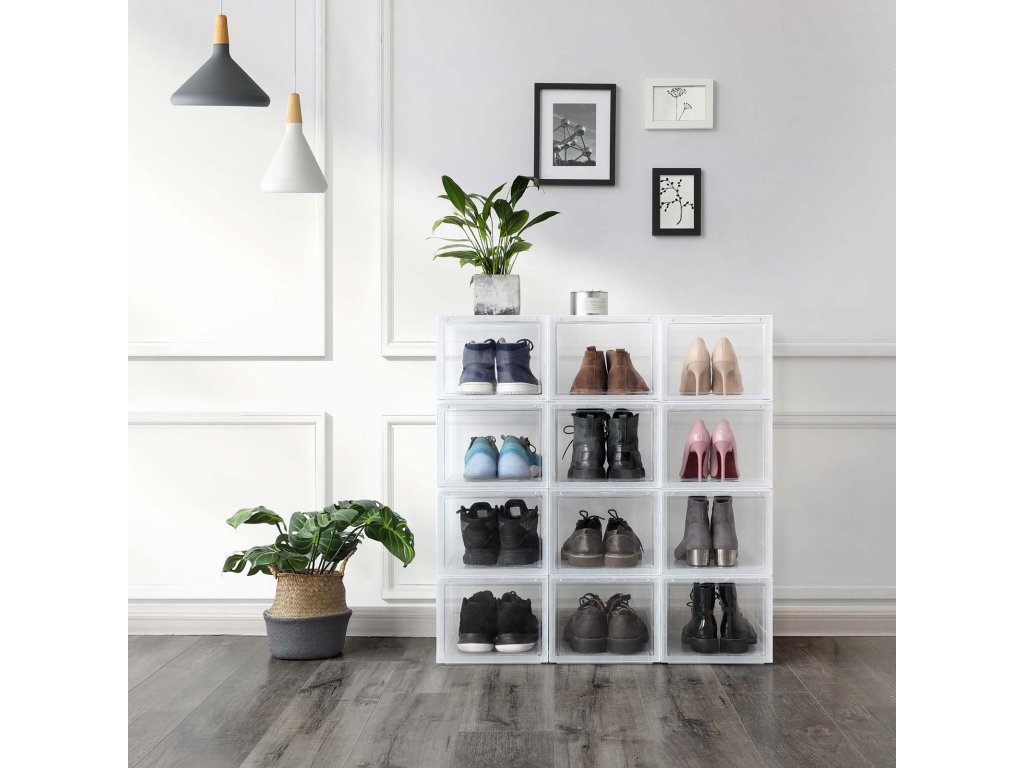 UŽ ŽÁDNÉ ROZHÁZENÉ BOTY: Rozptylují vás boty rozházené po celém domě? Každá krabice v této sadě 6 boxů na boty (26,5 x 33 x 19 cm) je vybavena speciální krabicí na boty. vnitřní rozměry) je dostatečně široká, aby se do ní vešel pár bot až do velikosti UK 11 a aby byly uspořádané.JSME JINÍ: Na rozdíl od jiných krabic na boty s víkem, které vás nutí s krabicemi pohybovat, abyste je otevřeli, jsou naše krabice na boty vybaveny průhlednými předními dvířky, abyste mohli boty snadno uchopit.STÁHOVAT JEDEN NA DRUHÝ: Tyto boxy jsou vyrobeny z odolného a pevného průhledného plastu a lze je stohovat; jedinečný design drážek v horní části zajišťuje, že boxy do sebe zapadají, aniž by se posouvaly nebo posouvaly.Jednodušší, než si myslíte: Naše krabice, které šetří místo, jsou zasílány v rozloženém stavu, takže na místo určení dorazí v pořádku; nebojte se, v balení najdete jasné pokyny, takže je sestavíte během několika minut;VŠESTRANNÉ POUŽITÍ: Jejich elegantní vzhled dodá každému prostoru kouzlo: lze je použít nejen na boty, ale také jako úložné boxy na dětské hračky, CD, ručníky, svetry nebo řemeslné potřeby.| Kategorie: | Botníky |