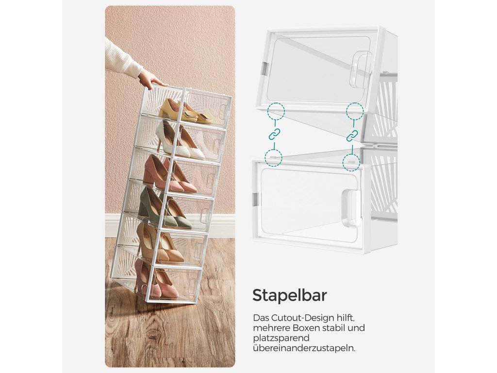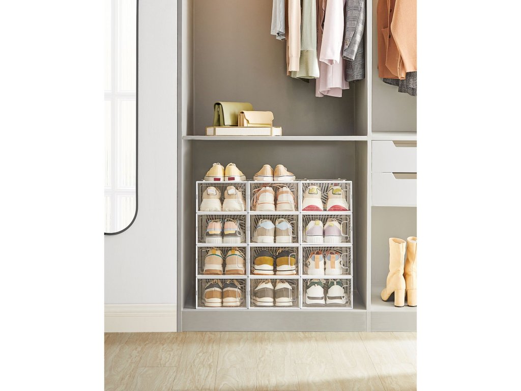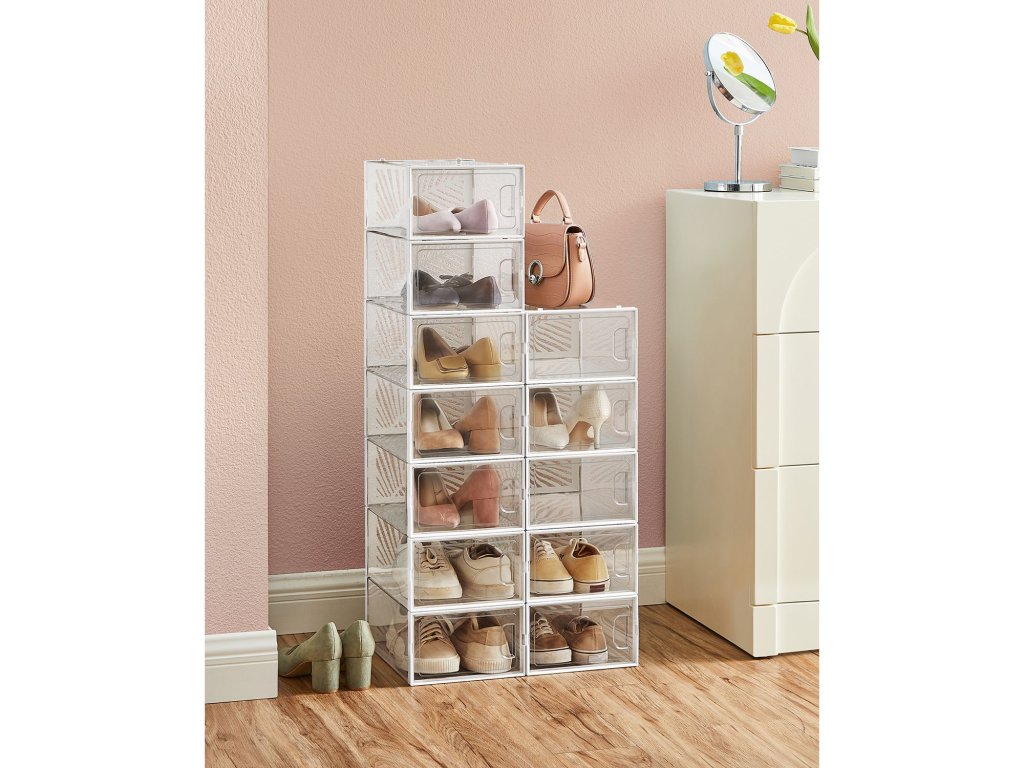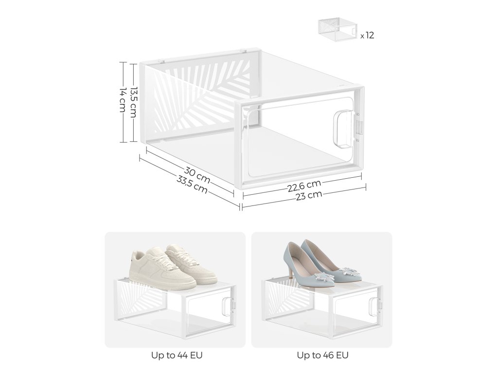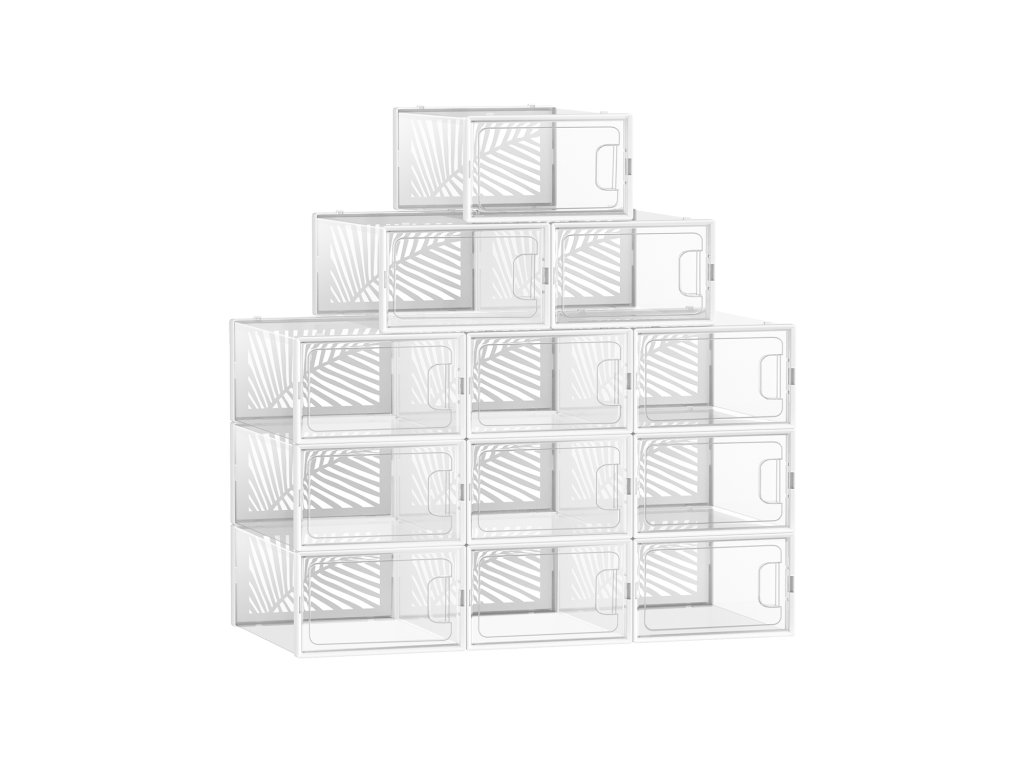 Průhledné krabice na boty Zcela průhledné - stačí se na krabice podívat a najdete ten správný pár. Nemusíte se tak každý den přehrabovat v neprůhledných krabicích na boty.Větrací otvory ve tvaru listu Zadní panel organizéru na boty je vybaven otvory ve tvaru listu, které organizéru dodávají nejen moderní styl. ale také umožňují dobrou cirkulaci vzduchu, aby se zabránilo nepříjemným pachům.Stabilita a úspora místa Vysoce kvalitní materiál PET v kombinaci s rámem ABS s výřezem zajišťuje stabilitu krabic na boty i při stohování. Využijte svůj prostor naplno a vystavte své boty na odiv.Sada 12 ks 12 snadno embosovatelných plastových boxů, každý o vnitřní velikosti 30 x 22,6 x 13,5 cm na boty do velikosti 44, které vám pomohou odstranit chaos během okamžiku! Tenisky pantofle a vysoké podpatky - vše v pořádkuVÍCEÚČELOVÉ Použijte je jako stohovatelné boxy na boty v šatně, ložnici, předsíni nebo pro uložení oblečení a doplňků. Průhledné boxy můžete také použít k vystavení krásných dekorativních předmětů.| Kategorie: | Botníky |