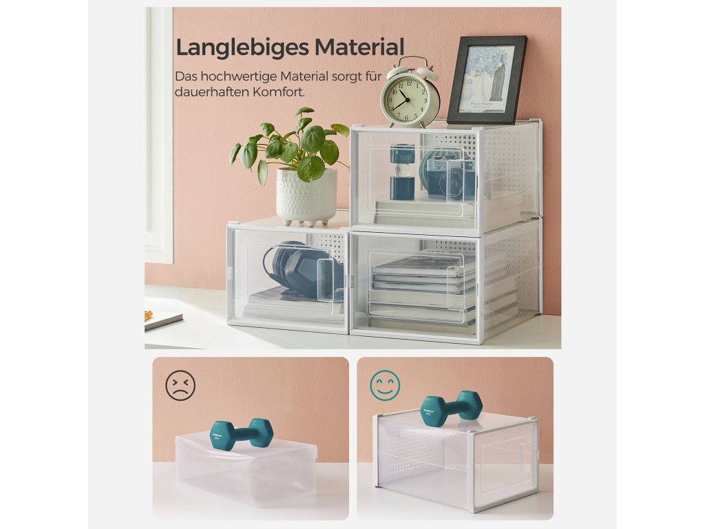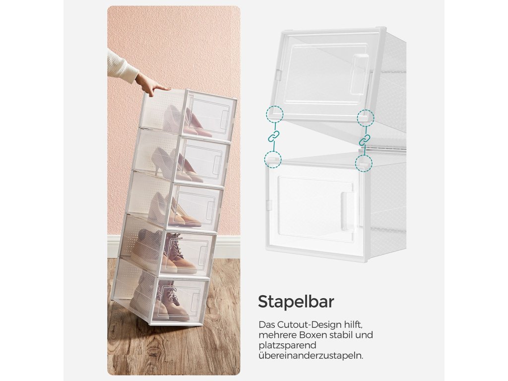 Mějte přehled Už se nemusíte neustále přehrabovat v jednotlivých krabicích od bot, abyste našli požadovaný pár. Díky těmto průhledným úložným boxům s víkem najdete každý pár bot na první pohled!.Připraveno během chvilky: stačí složit jednotlivé díly a stohovací boxy s vnitřními rozměry 31 x 24,5 x 17,5 cm, vhodné až do velikosti 46; tenisky, podpatky a lodičky mají konečně své místo;Stohovatelné nebo více na sobě Drážkový design na dně usnadňuje uspořádání stohovatelných krabic na boty - můžete je poskládat do věže nebo je dát na sebe; Boty jsou navíc dobře odvětrané díky větracím otvorům;Balení obsahuje 12 průhledných plastových boxů s předními dvířky, stohovatelných a skládacích s větracími otvory, s těmito boxy, které se snadno skládají a nezabírají místo, když se nepoužívají. se můžete brzy rozloučit s hromadami bot.| Kategorie: | Botníky |