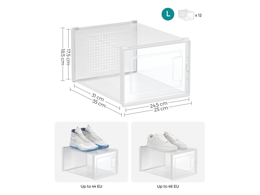 Boxy na boty, balení 12 stohovatelných organizérů na boty, skládací a univerzální pro tenisky, vhodné až do velikosti 10, průhledné a bílé.