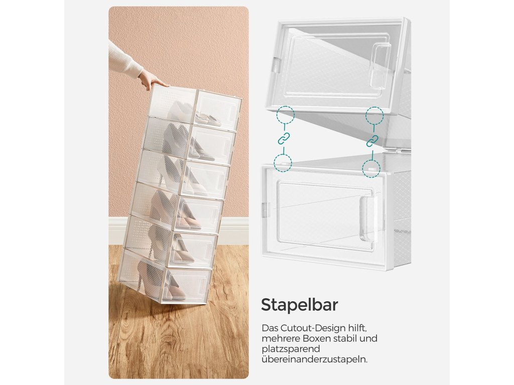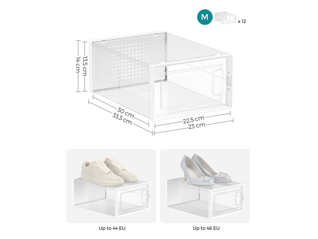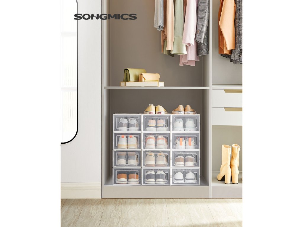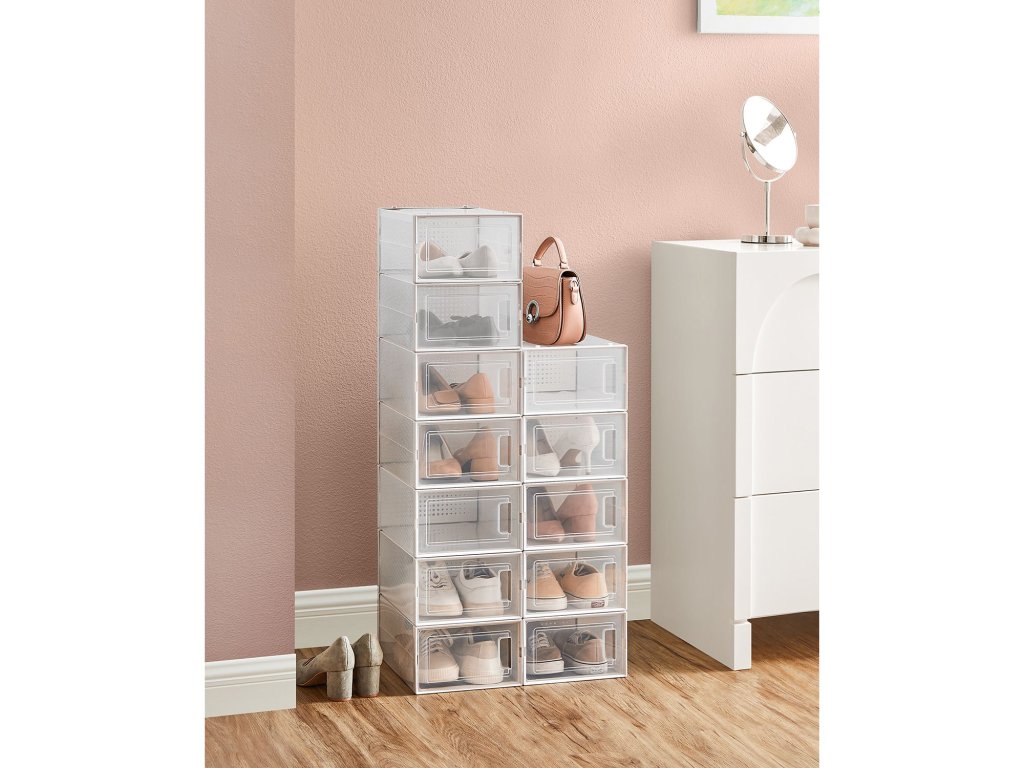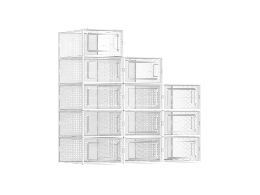Boxy na boty, balení 12 stohovatelných organizérů na boty, skládací a univerzální pro tenisky, vhodné až do velikosti 10,5, průhledné a bílé.