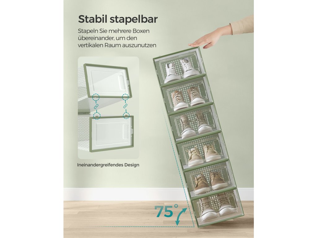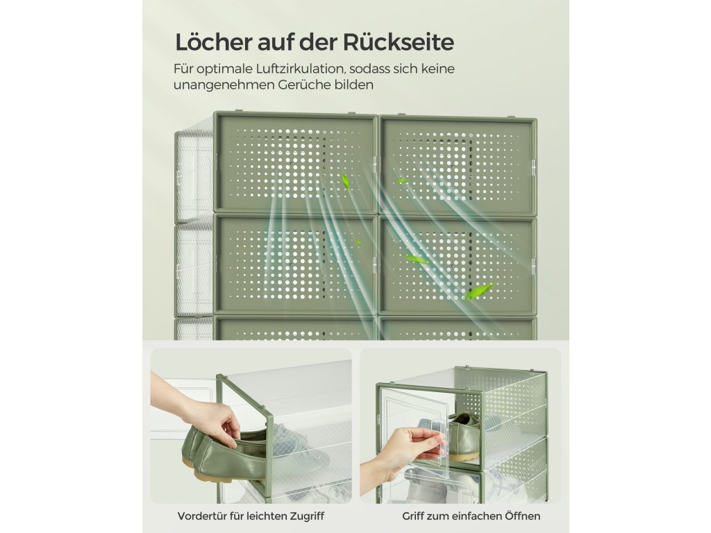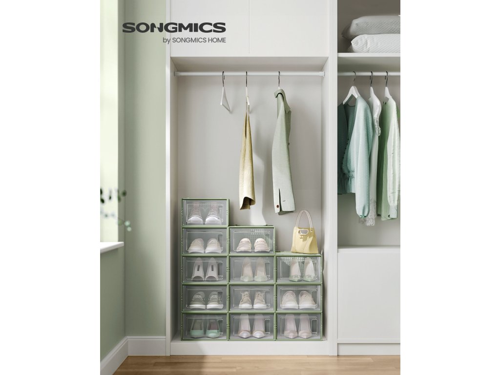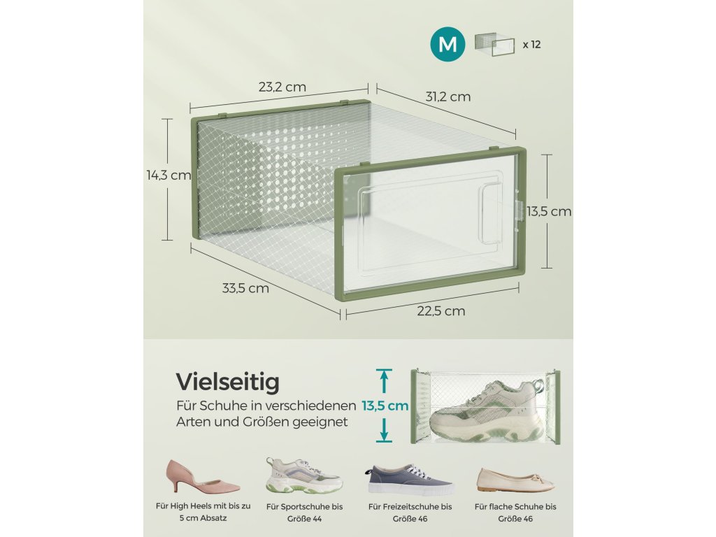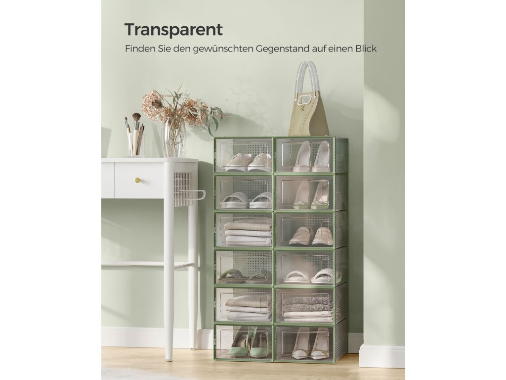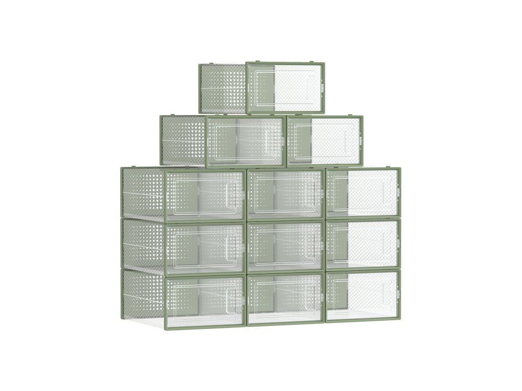 Boxy na boty, balení 12 stohovatelných organizérů na boty, skládací a univerzální pro tenisky, vhodné až do velikosti 11, průhledné a vavřínově zelené.