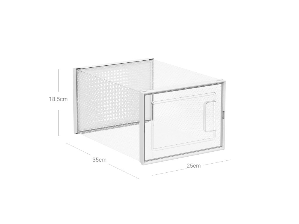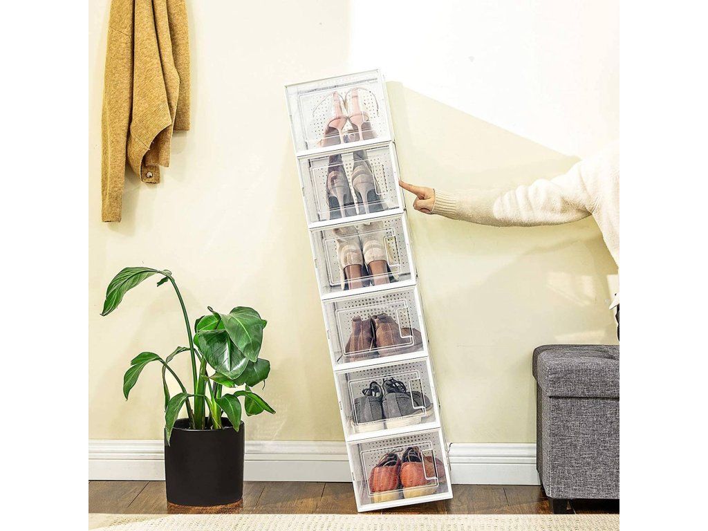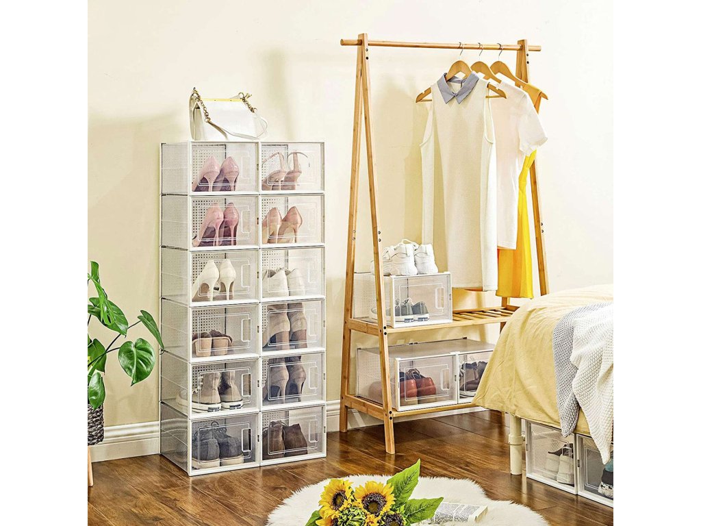 Boxy na boty, balení 18 stohovatelných organizérů na boty, skládací a univerzální pro tenisky, vhodné až do velikosti 12, průhledné a bílé.