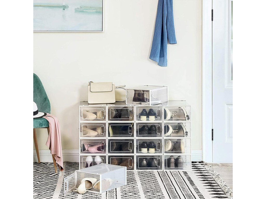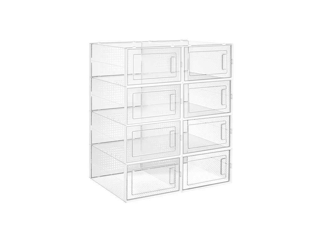 Boxy na boty, balení 8 stohovatelných organizérů na boty, skládací a univerzální pro tenisky, vhodné až do velikosti 10,5, průhledné a bílé.