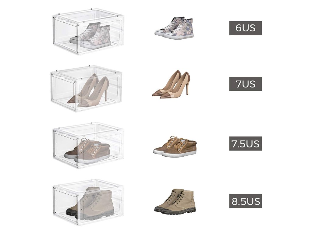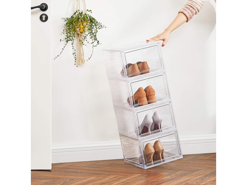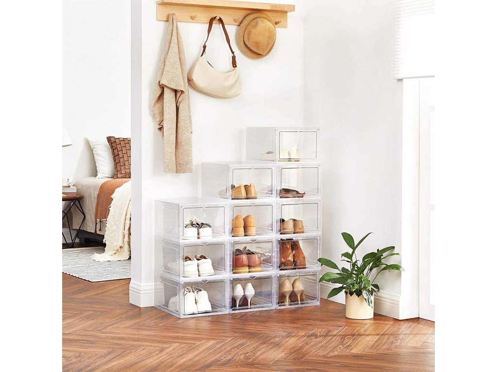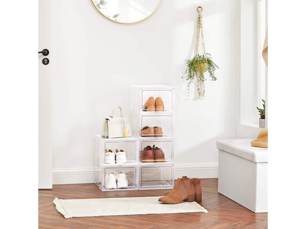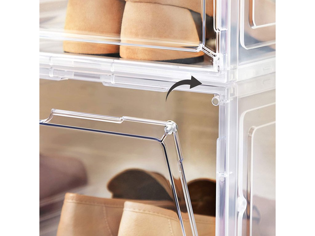 UŽ ŽÁDNÉ ROZHÁZENÉ BOTY: Rozptylují vás boty rozeseté po celém domě? Každá krabice v této sadě 6 boxů na boty (25,5 x 33 x 17,5 cm) je vybavena speciální krabicí na boty. vnitřní velikost) je dostatečně široká, aby se do ní vešel pár bot až do velikosti UK 10 a byl v nich pořádek.JSME JINÍ: Na rozdíl od jiných krabic na boty s víkem, které vás nutí s krabicemi pohybovat, abyste je otevřeli, jsou naše krabice na boty vybaveny průhlednými předními dvířky, abyste mohli boty snadno uchopit; výřez v horní části slouží jako rukojeť i větrací otvor;NA SOBĚ NEBO VEDLE SEBE? ZÁLEŽÍ NA VÁS! Díky plastovým čepům můžete stohovat jednu krabici na druhou nebo je spojit vedle sebe a vytvořit tak stojan na boty. montáž do úzké mezery nebo do volné stěny.