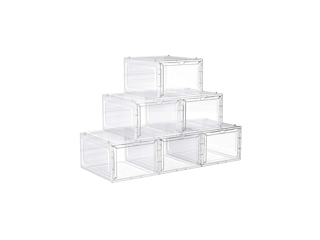 Boxy na boty, plastové organizéry na boty s průhlednými dvířky, sada 6 kusů, stohovatelné, snadná montáž, 27 x 34,5 x 19 cm, do velikosti UK 10, bílé.