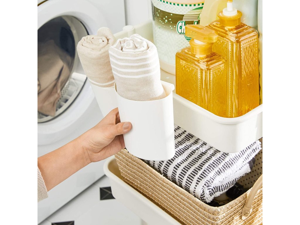 Zde je úložný talent: 3 úložné přihrádky, 2 malé závěsné přihrádky - tato kuchyňská police nabízí spoustu úložného prostoru, ale nezabírá mnoho místa. Umístěte ji do rohu svého domova a využijte každý centimetr.Flexibilní místo pevného: tento regál je vybaven 4 kolečky pro vysoké zatížení a lze jej snadno přesouvat z jedné místnosti do druhé - i když je plně naložený. Ať už poličku používáte doma nebo v kanceláři, vždy vám usnadní každodenní život.Dejte mu svou důvěru: tento robustní kuchyňský vozík si vaši důvěru zaslouží. Plastové police jsou podepřeny ocelovými trubkami a každá přihrádka vydrží zátěž až 10 kg. Tato police vydrží dlouho.NO HEADBREAKS: složitá montáž? Tady ne! Díky označeným dílům a vyobrazenému návodu je montáž tohoto servírovacího vozíku snadná. Všechny díly stačí spojit dohromady pomocí přiložených šroubů.| Kategorie: | Koupelnový nábytek |