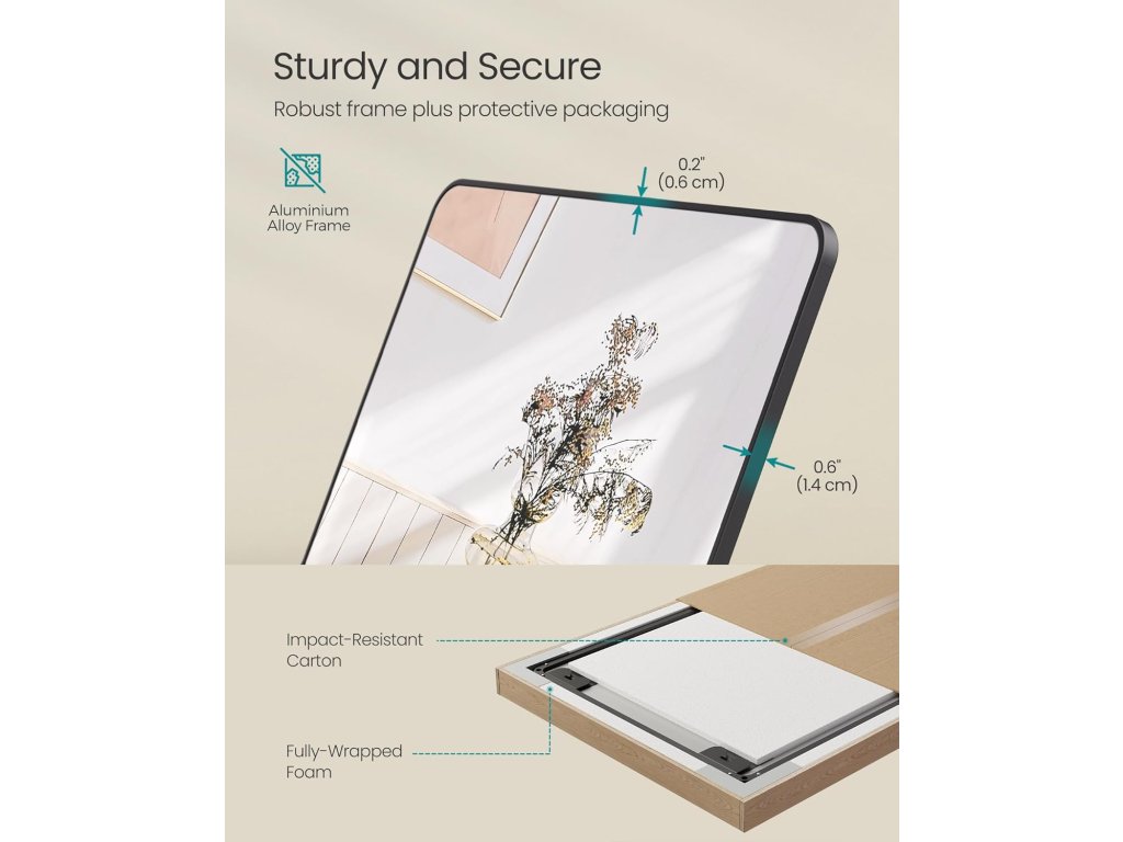 【PŘIPRAVENO K POUŽITÍ】 Toto zrcadlo v plné délce není třeba montovat, je připraveno k použití. Díky lehkému rámu jej lze snadno přemístit a umístit na libovolné místo v domácnosti.