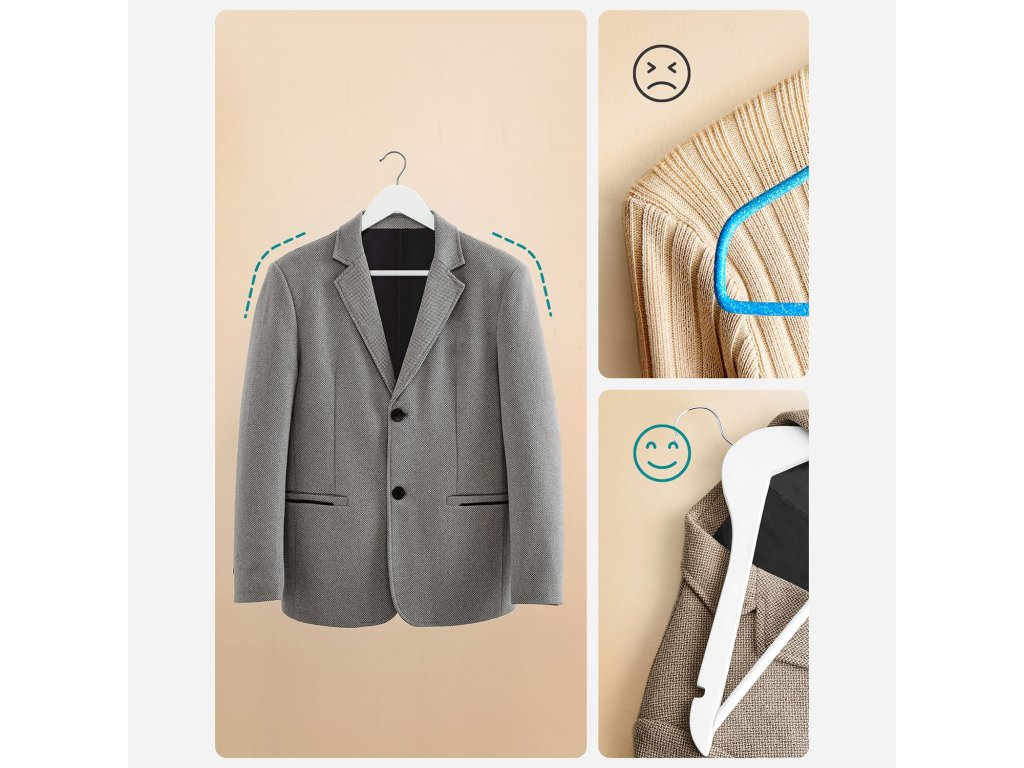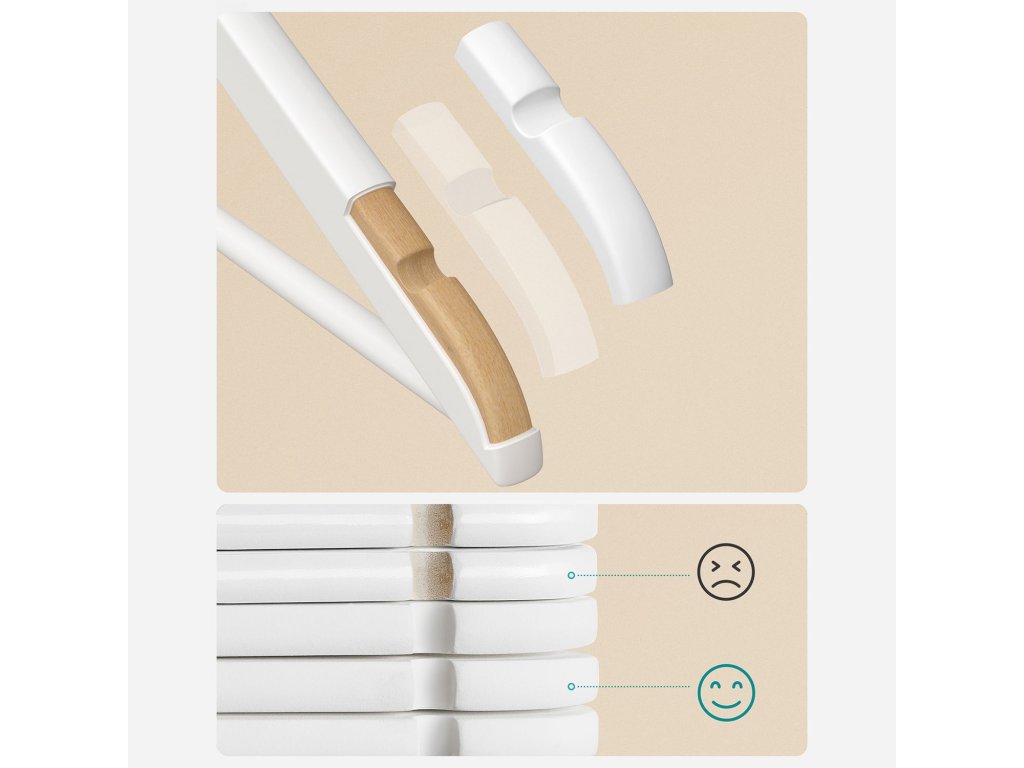Gumový potah šetrný k oděvům: ramínka jsou opatřena gumovým potahem, a to i na zářezech v oblasti ramen. který vytváří příjemně hladký povrch a chrání vaše elegantní obleky nebo košile před poškrábáním.Žádné nevzhledné otisky: dřevěná ramínka jsou tvarována tak, aby kopírovala křivky lidských ramen, takže oblečení zůstane v původním tvaru a na oděvech nezůstanou nepříjemné otisky.NESKLUZAVÉ - Gumový povlak zvyšuje tření, takže tyto dřevěné věšáky jsou protiskluzovější než tradiční dřevěné věšáky. Na ramínko lze zavěsit i hedvábnou halenku, aniž by sklouzla.