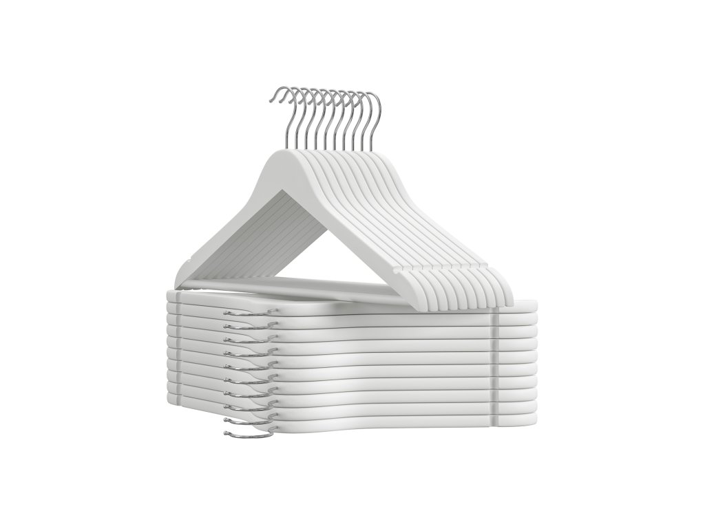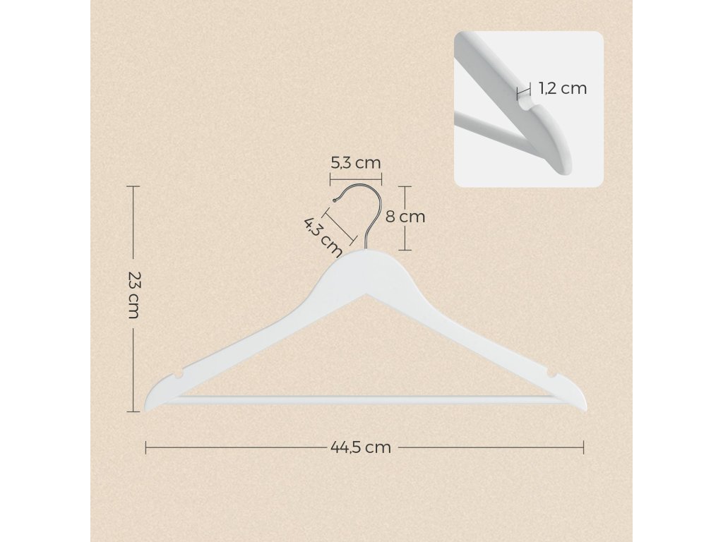 Sada 20 gumových věšáků na kabáty z masivního dřeva s protiskluzovými zářezy v oblasti ramen a tyčí na kalhoty otočná o 360°. Na obleky, košile, kabáty, bílá.