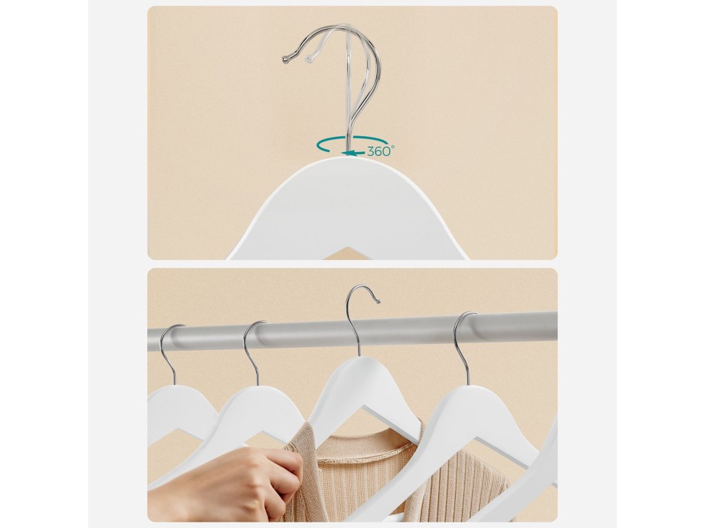 ROTAČNÍ HÁČKY - Každý z těchto dřevěných věšáků má odolný chromovaný kovový háček otočný o 360°. Pokud jste oblečení pověsili špatně, můžete je snadno otočit, aniž byste je museli sundávat.