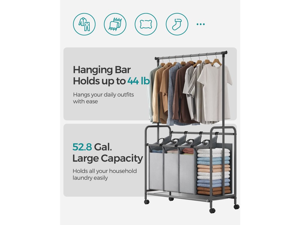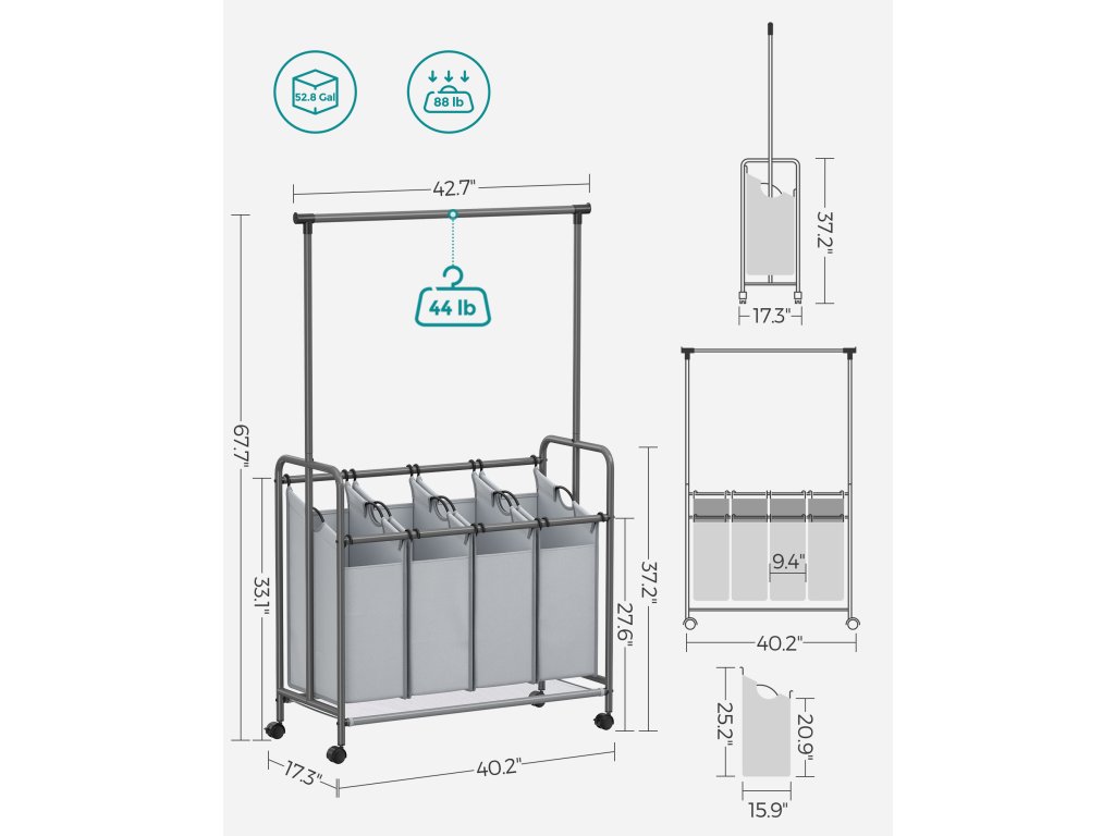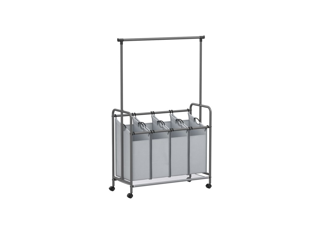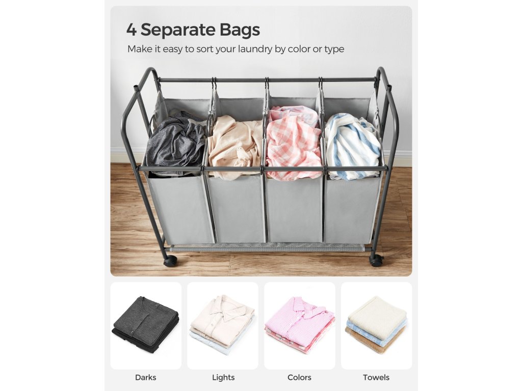Čtyřdílný třídič prádla, pojízdný koš na prádlo s tyčí na zavěšení, koš na prádlo s vysokou odolností, uzamykatelné koše na prádlo na kolečkách, 4 x 13,2 gal., šedý.