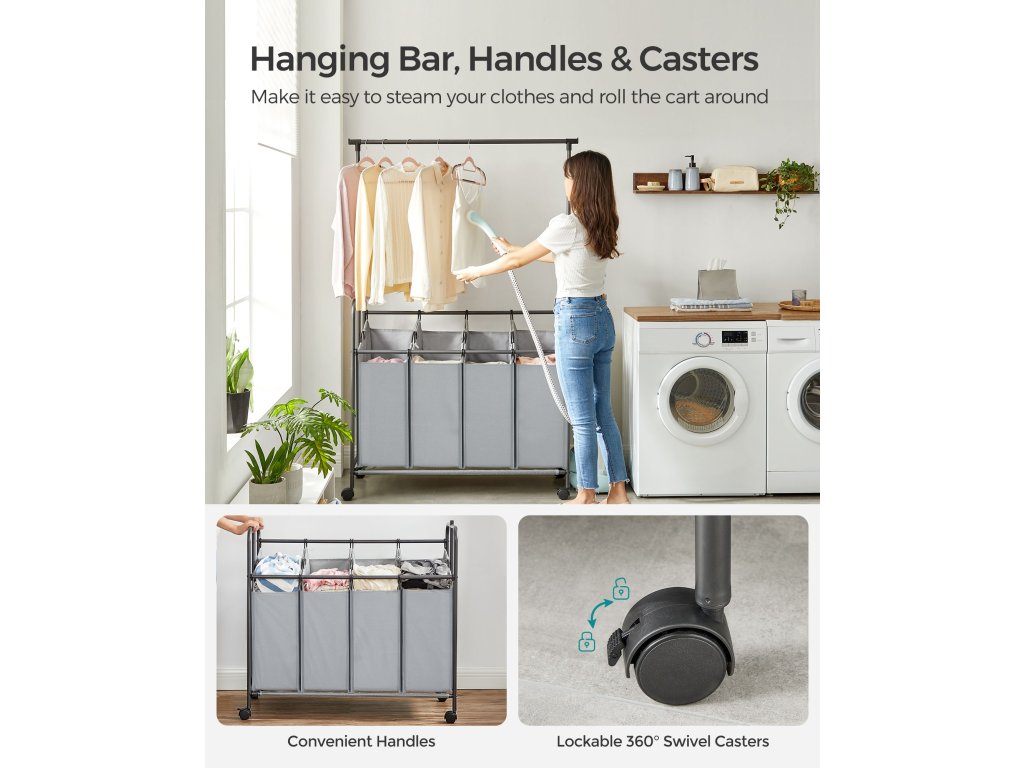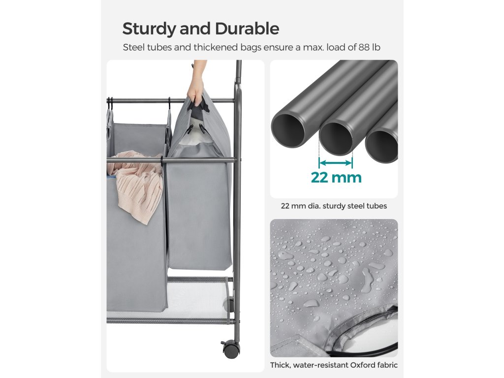 52.8 Gal. Kapacita a závěsná lišta Kapacita 52,8 galonu, závěsná lišta o délce 42,5'' - tento pojízdný koš na prádlo vám nabízí spoustu úložného prostoru pro organizaci veškerého prádla v domácnosti a přidává další prostor pro zavěšení do vaší ložnice nebo prádelny.4 oddíly, snadné třídění prádla Díky 4 samostatným sáčkům na prádlo je v tomto koši prádlo roztříděné podle barev nebo druhů a připravené k odnesení. zkrácení doby třídění, aby byl den praní prádla hračkou.Snadné přemístění a zajištění na místě Díky kolejničkám jako držadlům a 4 kolečkům můžete tento třídič prádla snadno přemístit z ložnice nebo koupelny do prádelny. A 2 uzamykatelná kolečka udrží vozík v případě potřeby na místě.Přenosné sáčky na prádlo 4 sáčky na prádlo s kovovými uchy jsou odnímatelné. abyste mohli snadno vytáhnout libovolný sáček a odnést ho do pračky, místo abyste museli nosit celý třídič prádla do prádelny.Robustní a odolné Zesílená tkanina 600D Oxford, podepřená robustní tkaninou o průměru 22 mm. ocelových trubek, vznikl robustní pojízdný koš na prádlo, který unese až 88 lb, přičemž 4 sáčky unesou až 44 lb a závěsná lišta 44 lb.| Kategorie: | Koše na prádlo |