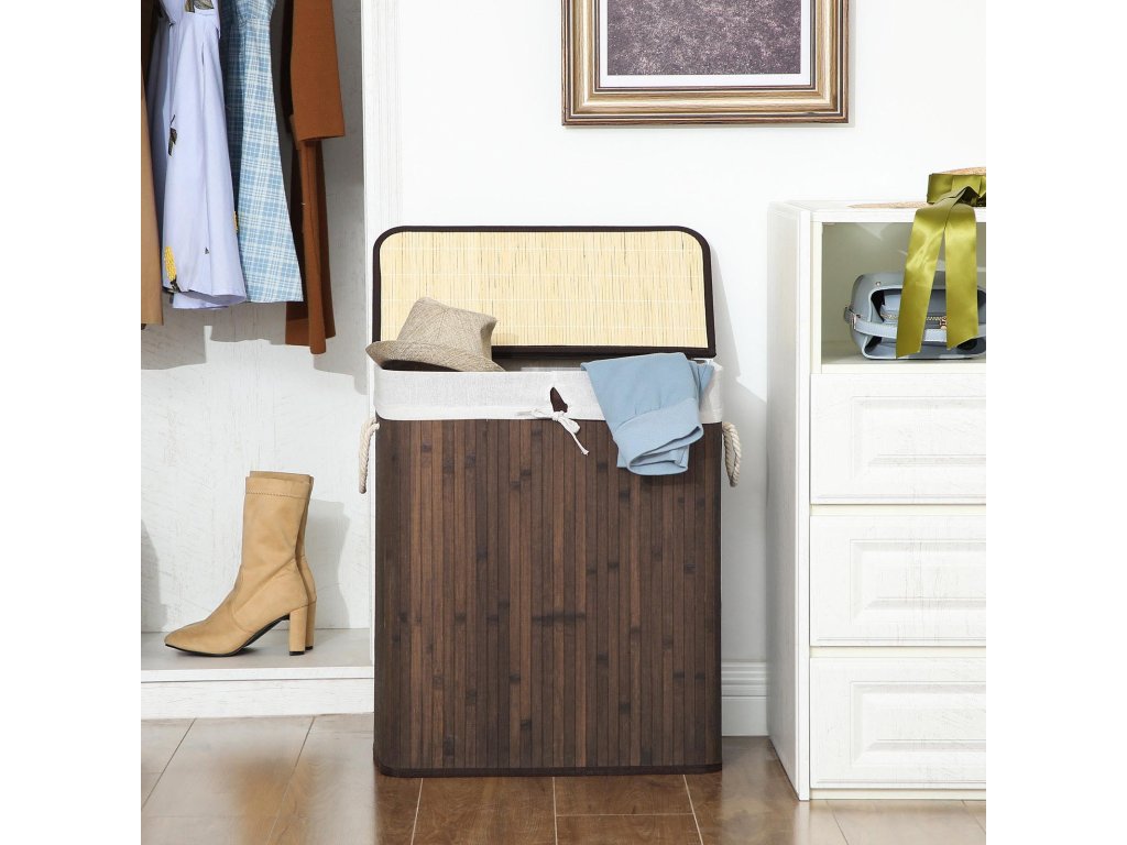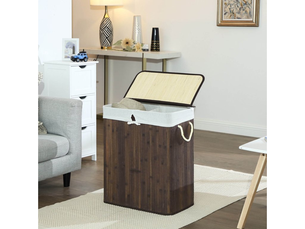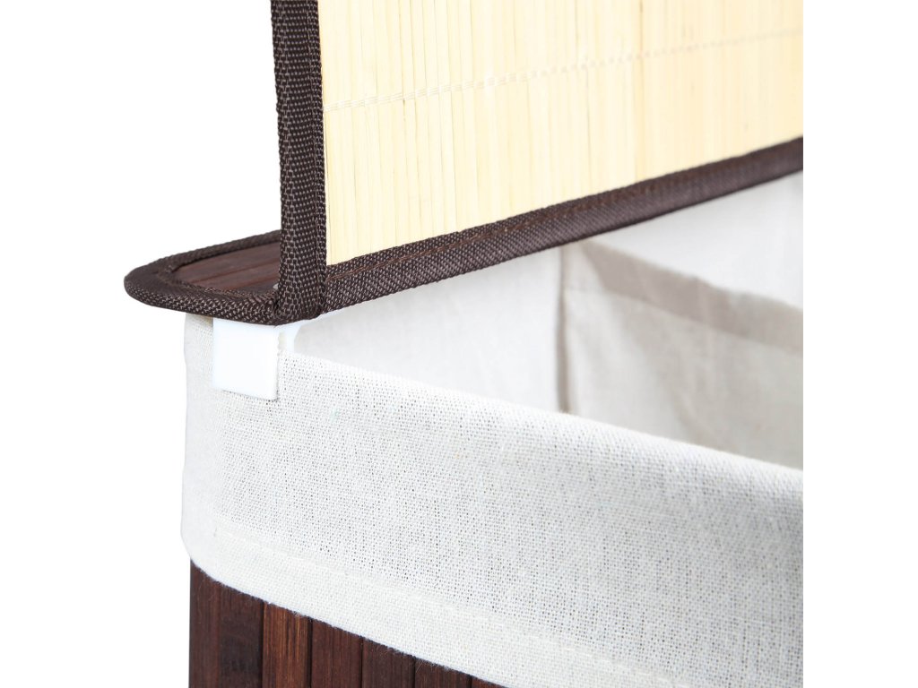 Dělený koš na prádlo s víkem, bambusový koš na prádlo se 2 oddíly, vyjímatelné vložky, bavlněná madla, objem 100 l, do prádelny, ložnice, hnědý.