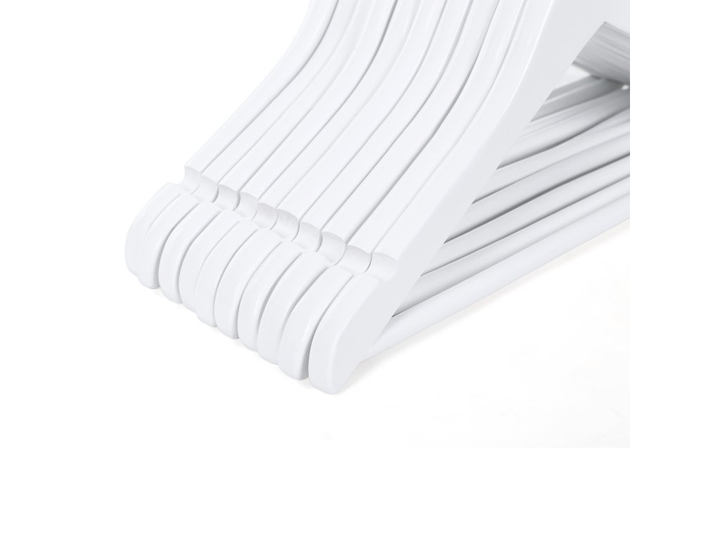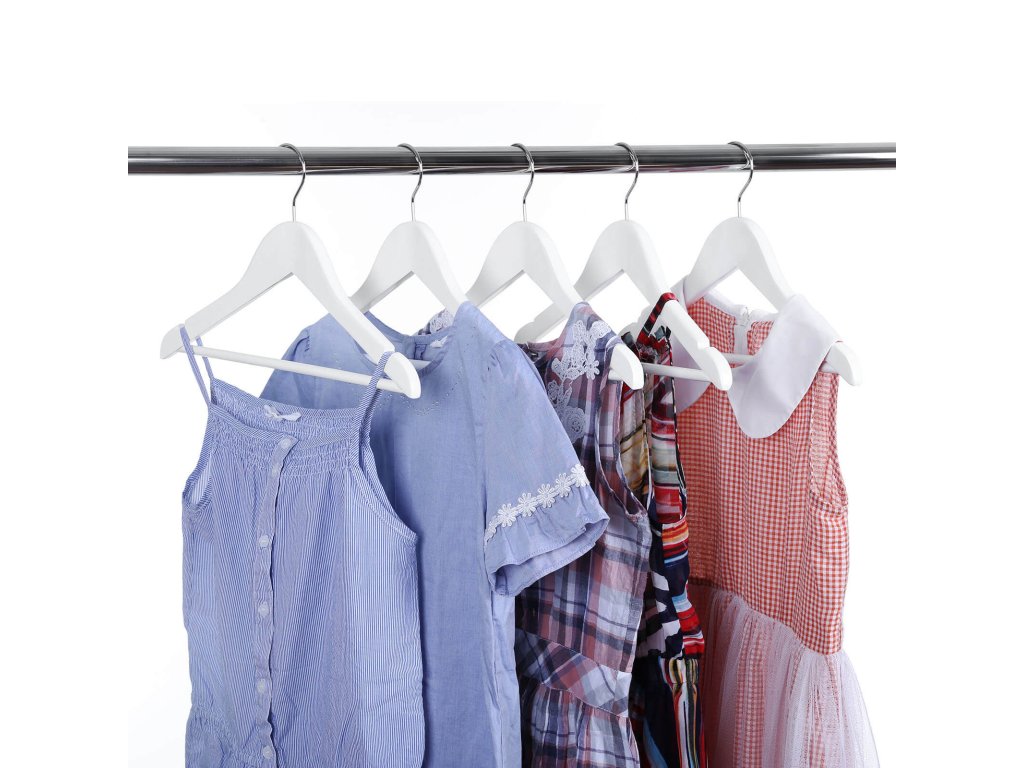 Dětské věšáky na oblečení z masivního dřeva, balení 20 kusů, s můstkem a zářezy, 360° otočný háček bílý 35 cm.