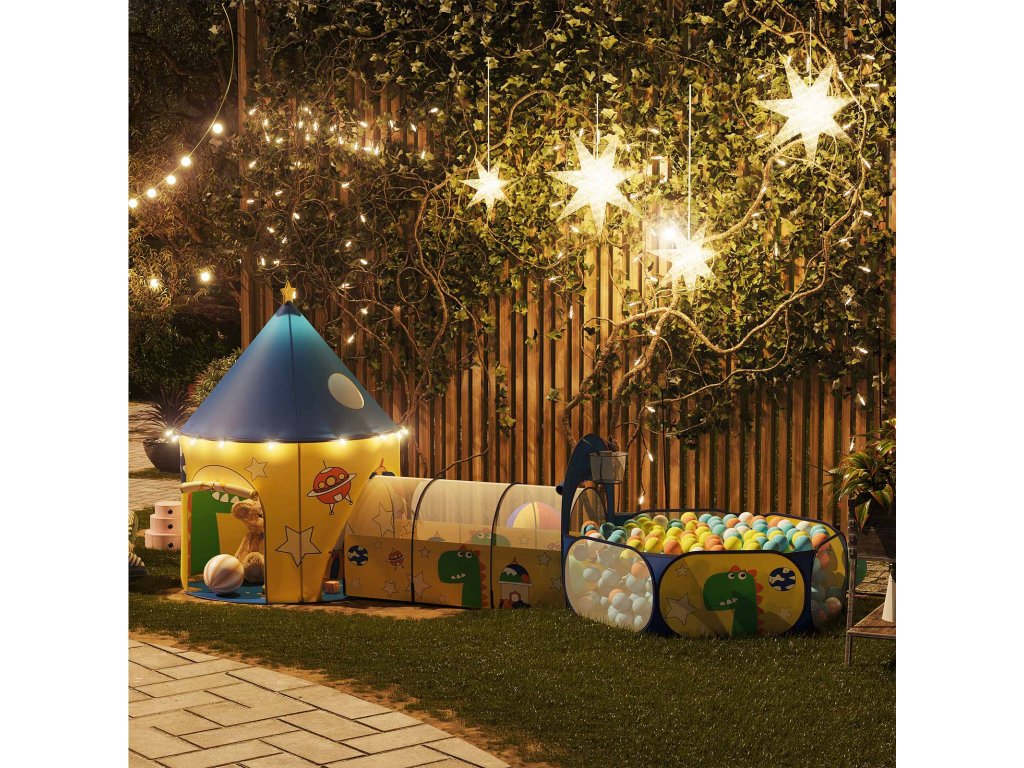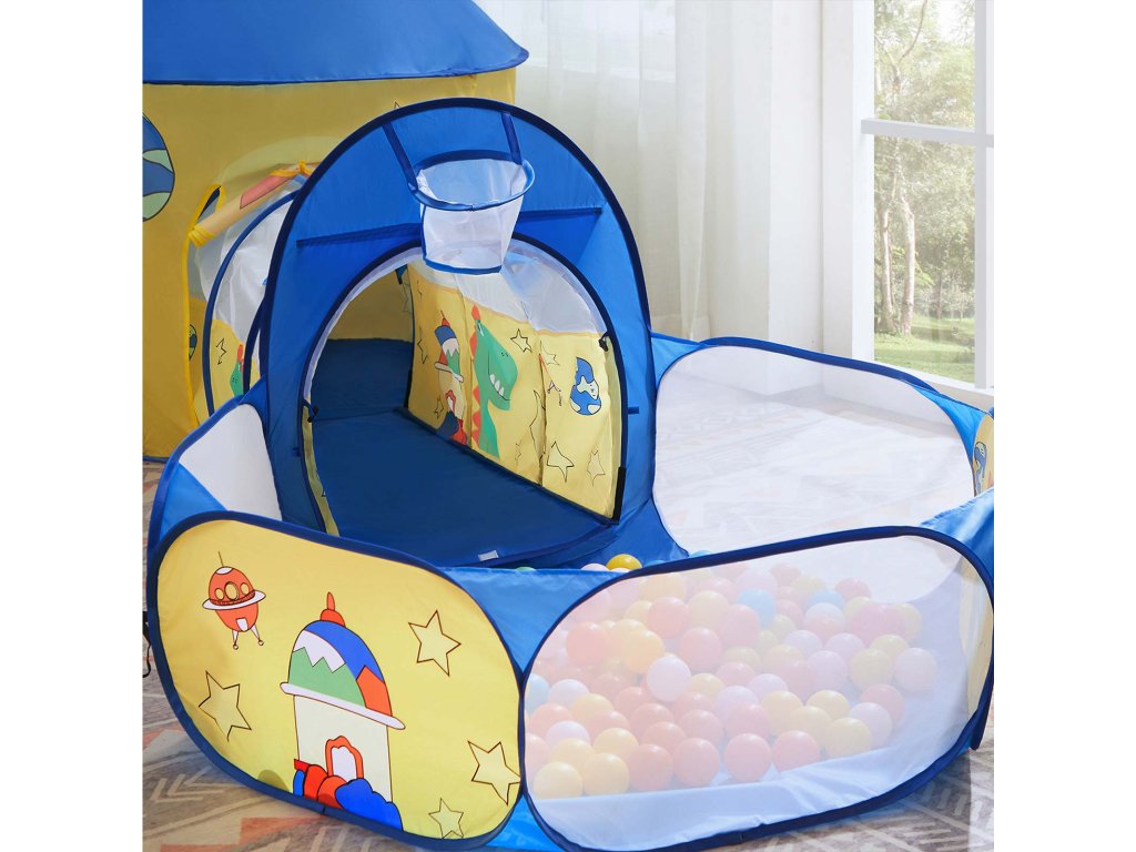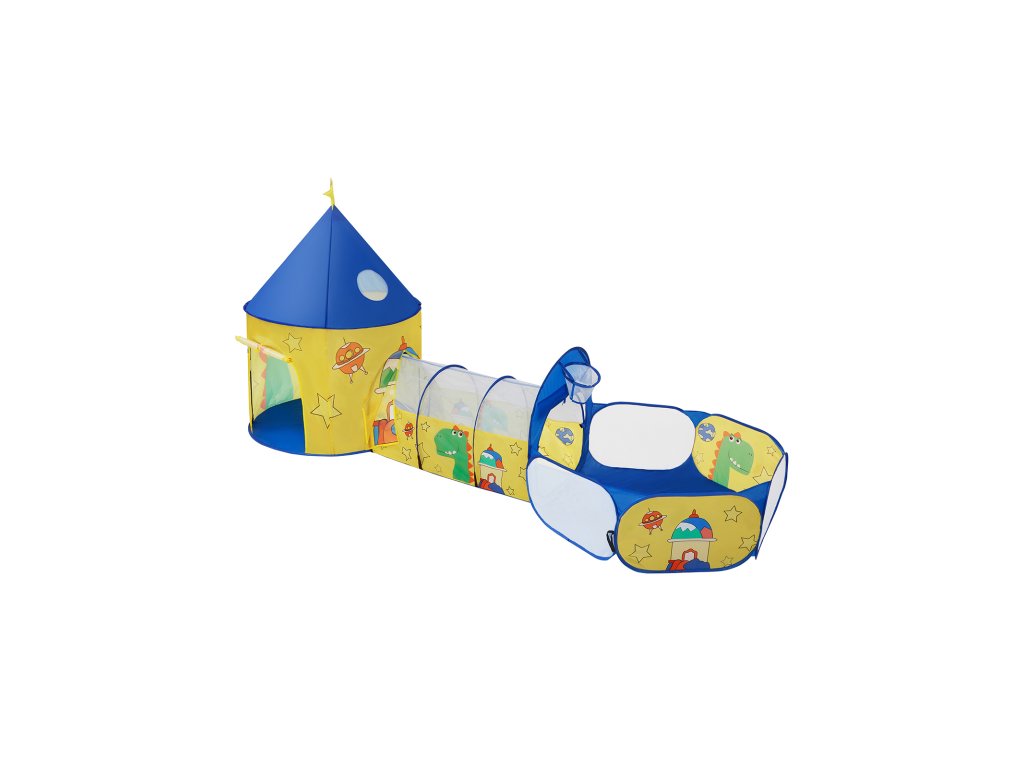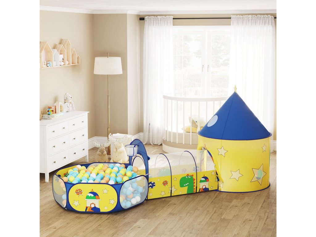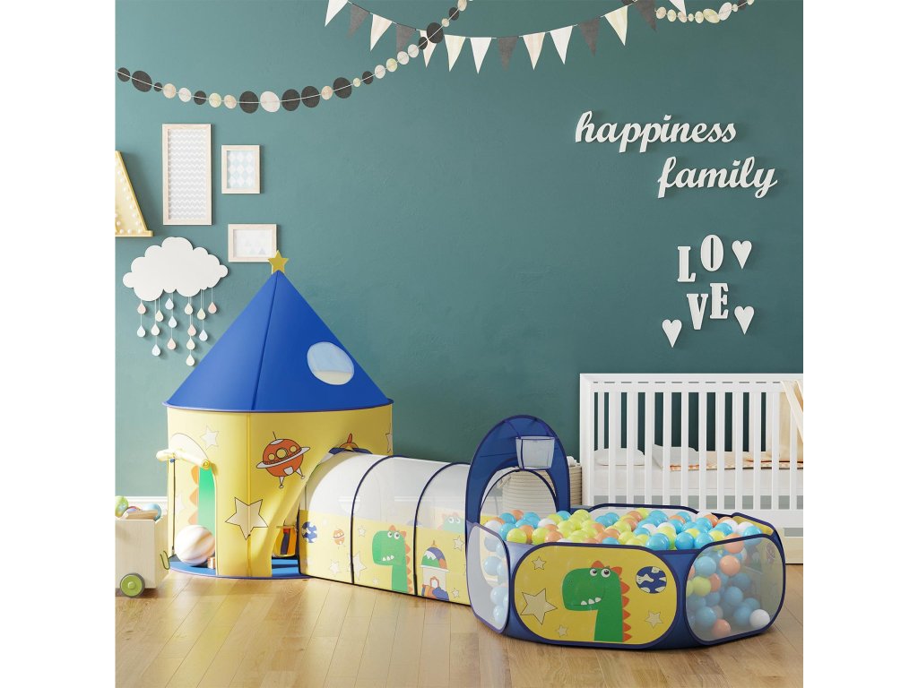 Dětský hrací stan 3 v 1, tunel, hřiště s míčem, pro chlapce, dívky a batolata, dětský vyskakovací stan s raketou, vnitřní nebo venkovní použití, nápad na dárek, narozeninová oslava, žlutá a modrá.